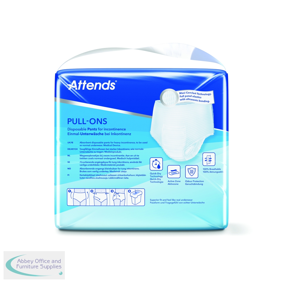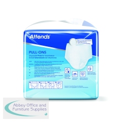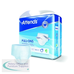 These size XLarge Attends Pull-Ons are absorbent, disposable incontinence pants designed for heavy to severe urinary and/or faecal incontinence. They are unisex and designed to fit like regular underwear, featuring a flexible shape and breathable material to maintain skin health. This pack contains 4 packs of 14 pants (56 pants in total).