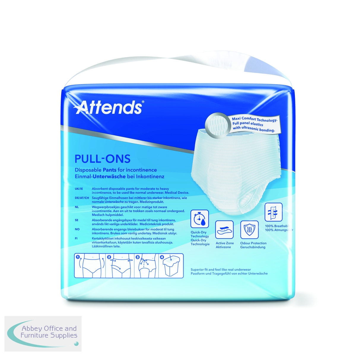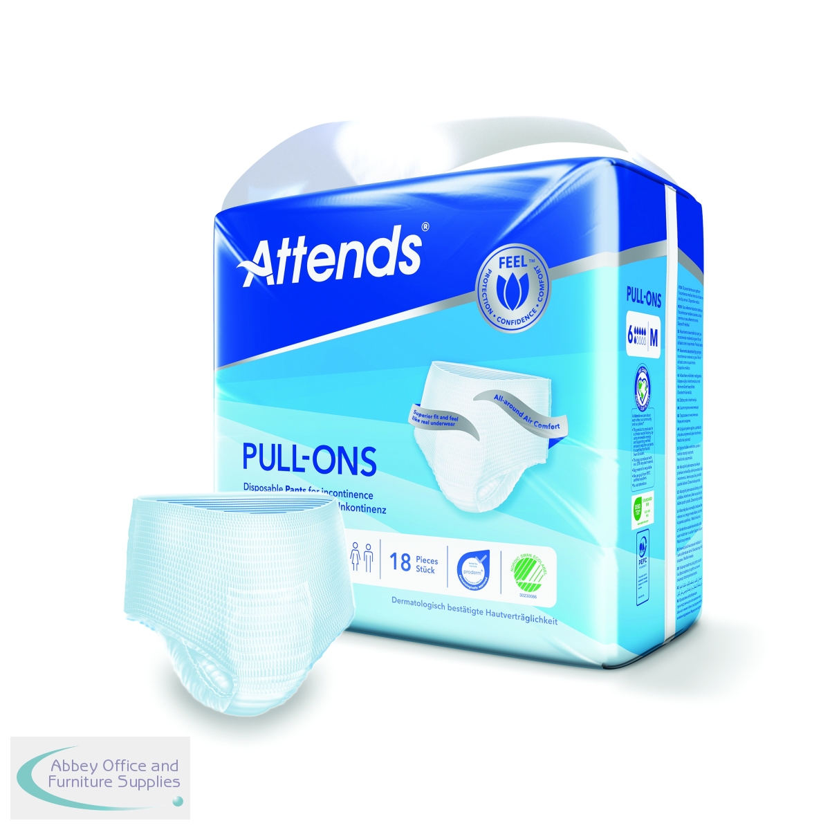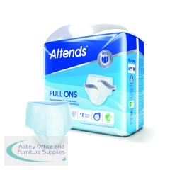 These size Medium Attends Pull-Ons are absorbent, disposable incontinence pants designed for moderate to heavy urinary and/or faecal incontinence. They are unisex and designed to fit like regular underwear, featuring a flexible shape and breathable material to maintain skin health. This pack contains 4 packs of 18 pants (72 pants in total).