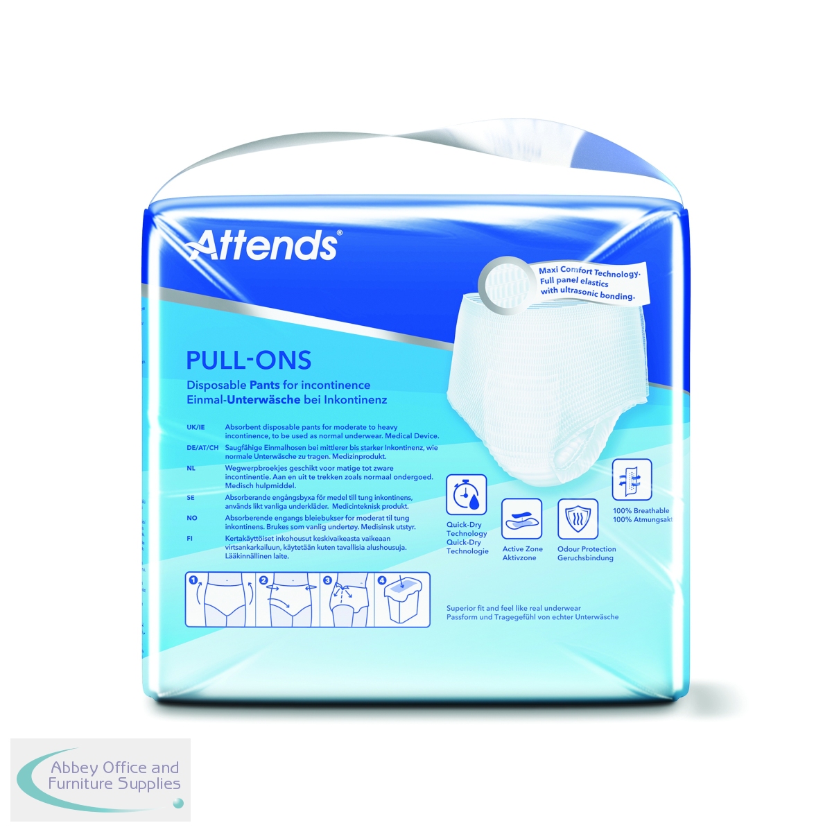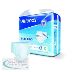These size XLarge Attends Pull-Ons are absorbent, disposable incontinence pants designed for moderate to heavy urinary and/or faecal incontinence. They are unisex and designed to fit like regular underwear, featuring a flexible shape and breathable material to maintain skin health. This pack contains 4 packs of 16 pants (64 pants in total).