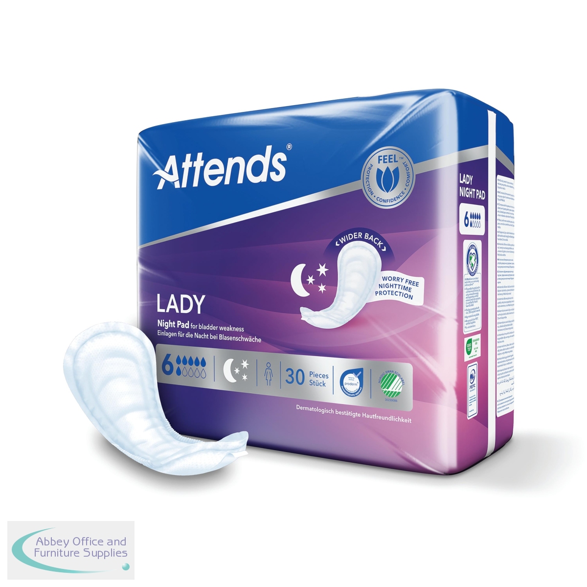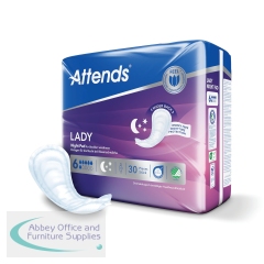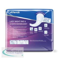 Attends Lady Night Pad 6 is an anatomically shaped pad for overnight use which is wider at the back for extra protection during the night. It is designed for women who experience moderate to heavy urinary incontinence. The wider back helps prevent leaks whilst lying down. The highly absorbent core helps quickly lock away liquid, to keep your skin dry and healthy. Supplied in a pack of 30.