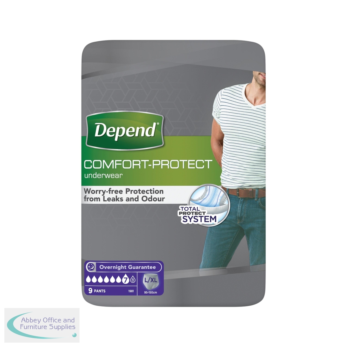 Depend Comfort Protect Incontinence pants for men are disposable pull-up pants designed to provide discreet, heavy-duty protection with a fit that feels like regular underwear. Made from soft breathable, cotton-like fabric that is latex-free and fragrance-free, the pants have a discreet design with a low-rise waistband and oval leg openings to remain invisible under clothing. Supplied in a pack of 9.