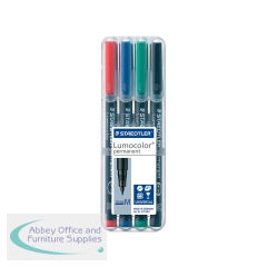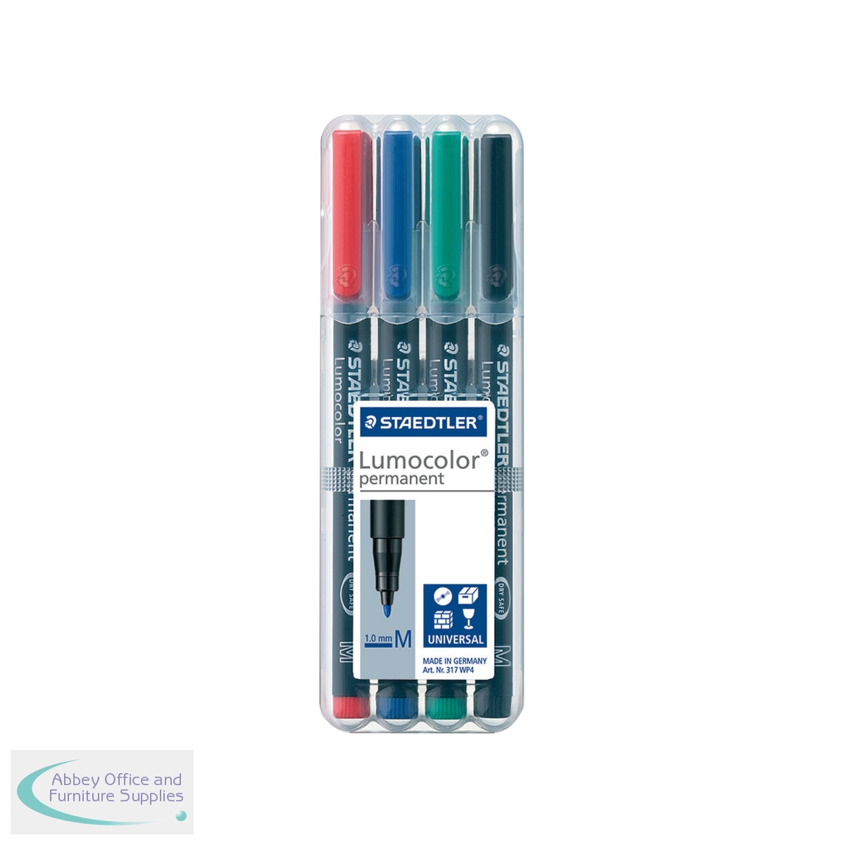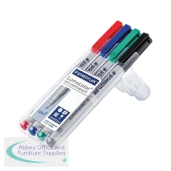 This premium Staedtler Lumocolour pen has been specially developed for use on overhead projection film for stylish presentations. This versatile pen is also suitable for use on a variety of other surfaces including glass, CDs, plastic, porcelain, wood and leather. The permanent ink is fast drying to avoid smudging and provides vibrant, high intensity colour. The medium 1.0mm tip is great for neat, legible writing, drawing, diagrams and more. This pack contains 4 assorted pens in Black, Blue, Green and Red.