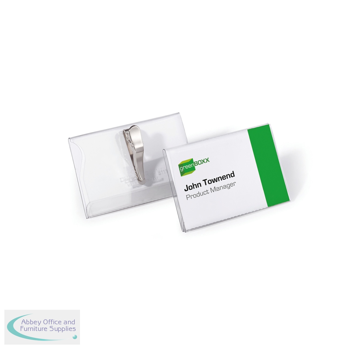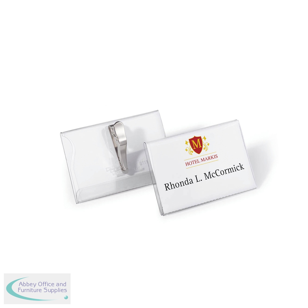Durable Name Badge is a glass clear transparent plastic name badge with crocodile clip for quick and easy fastening. The crocodile clip will attach to clothing without causing any damage. The badge is made of hard PVC for a robust finish. Blank insert cards are also included. Size: 54x90mm.