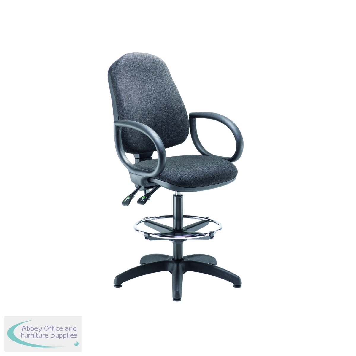 This High Back Draughtsman Chair has a metal foot ring, perfect for working at high desks and workbenches. The chair is upholstered in fabric and comes on a black five star glide base.
