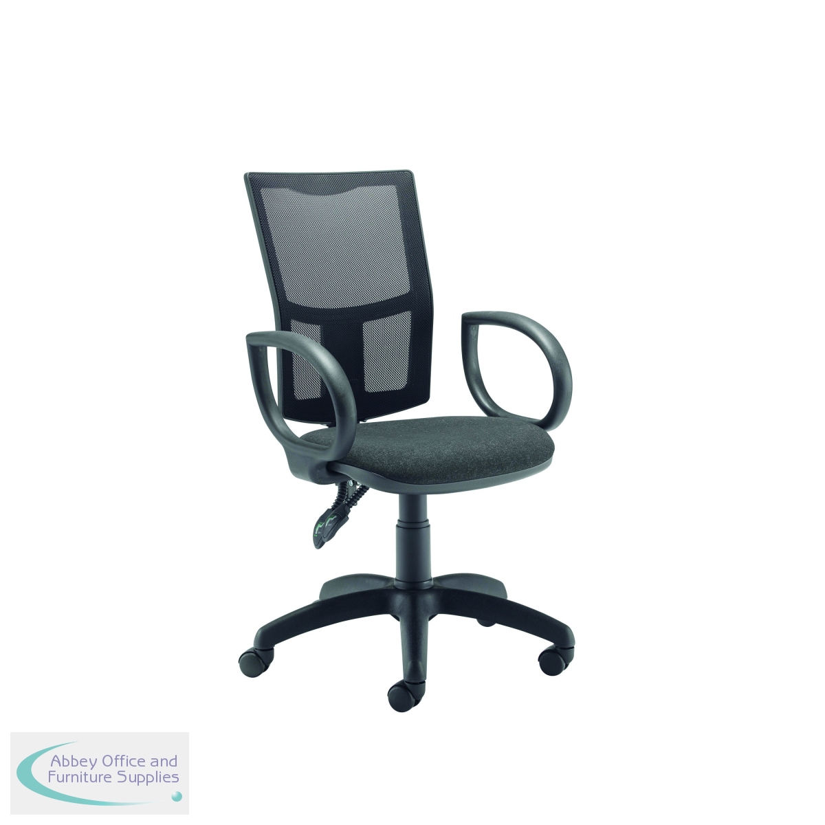 The Operator Chair has a mesh back and fabric seat with fixed loop arms. The permanent contact back (PCB) ensures user comfort for up to 8 hours for users up to 23 stone. The overall dimensions are 640x640x1010-1175mm,