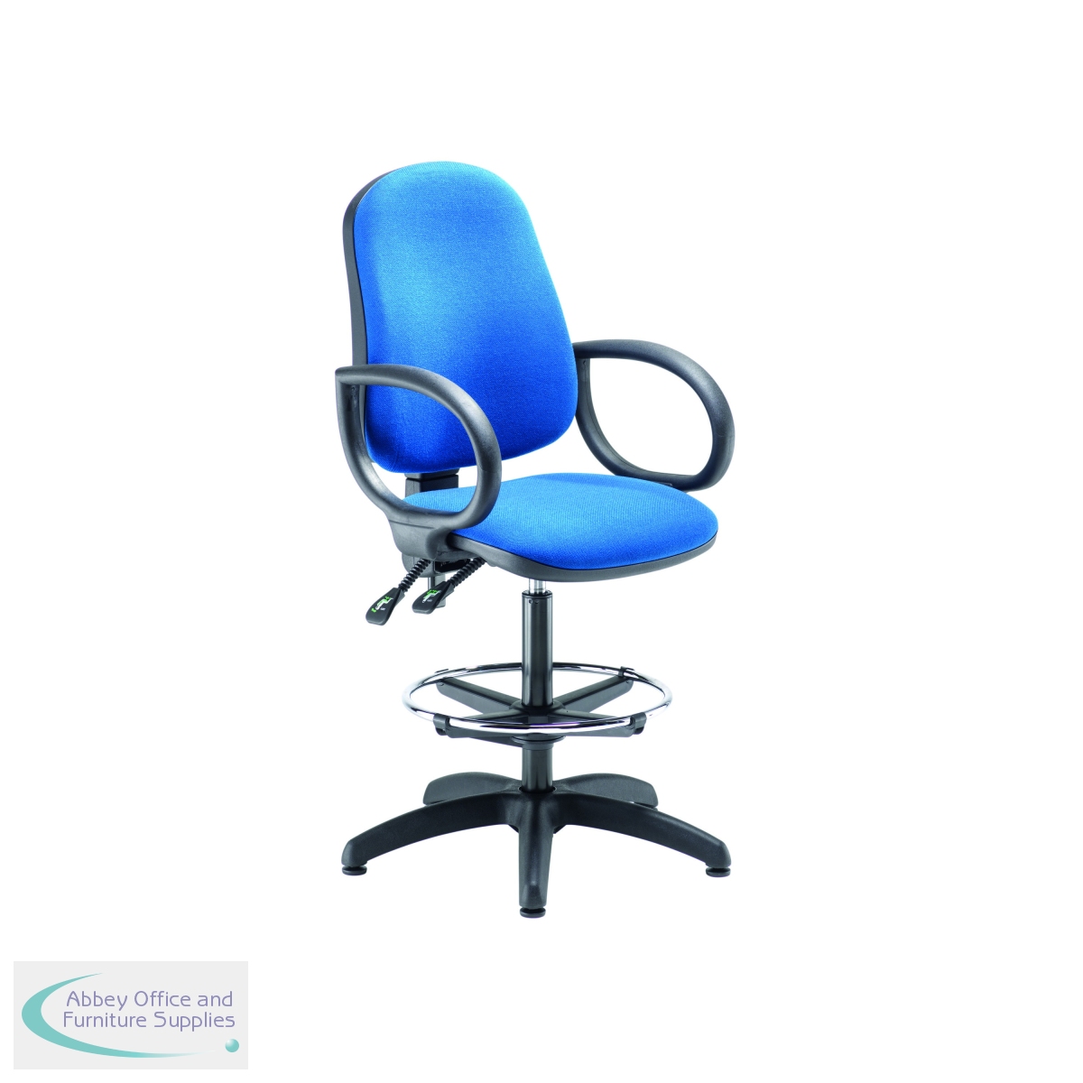 This High Back Draughtsman Chair has a metal foot ring, perfect for working at high desks and workbenches. The chair is upholstered in fabric and comes on a black five star glide base.