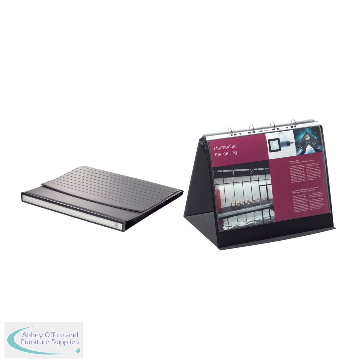 A range of high-quality and stylish presentation table flipcharts. Created for a wide range of uses such as trade fairs and exhibitions as well as training courses, but also for a personalised presentation to a select group. The quality of this range is evident through the soft ribbed metallic grey PVC material, along with a unique removable spine label for the easy identification of all presentations. All DURASTAR presenters can be stored vertically.