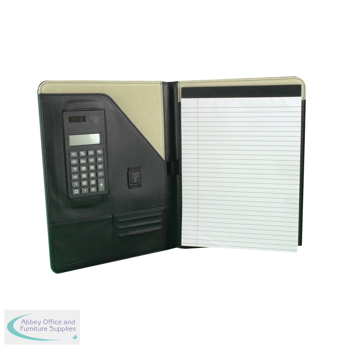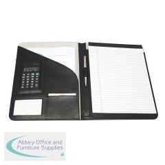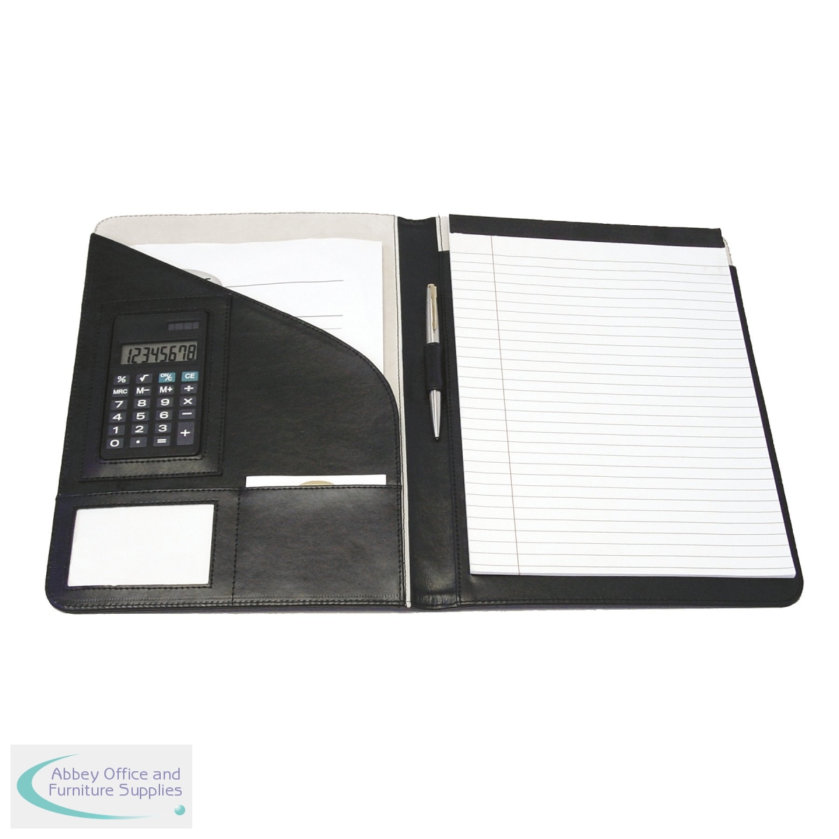 The Monolith leather conference folder offers an executive look ideal for business meetings. Finished in a bonded leather with a luxurious suedette lining and an integrated calculator, the folder also features business card pockets, an A4 pad and pad holder, a pocket to store loose documents and a pen loop in the centre.