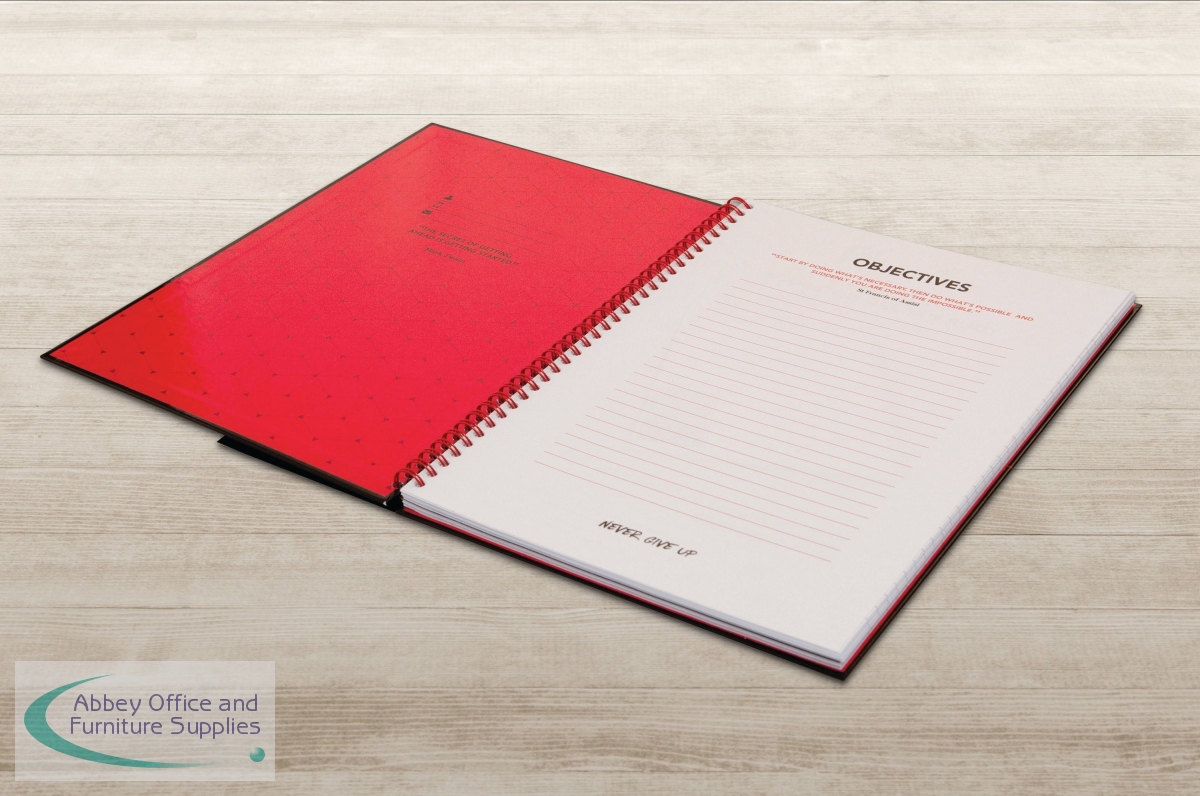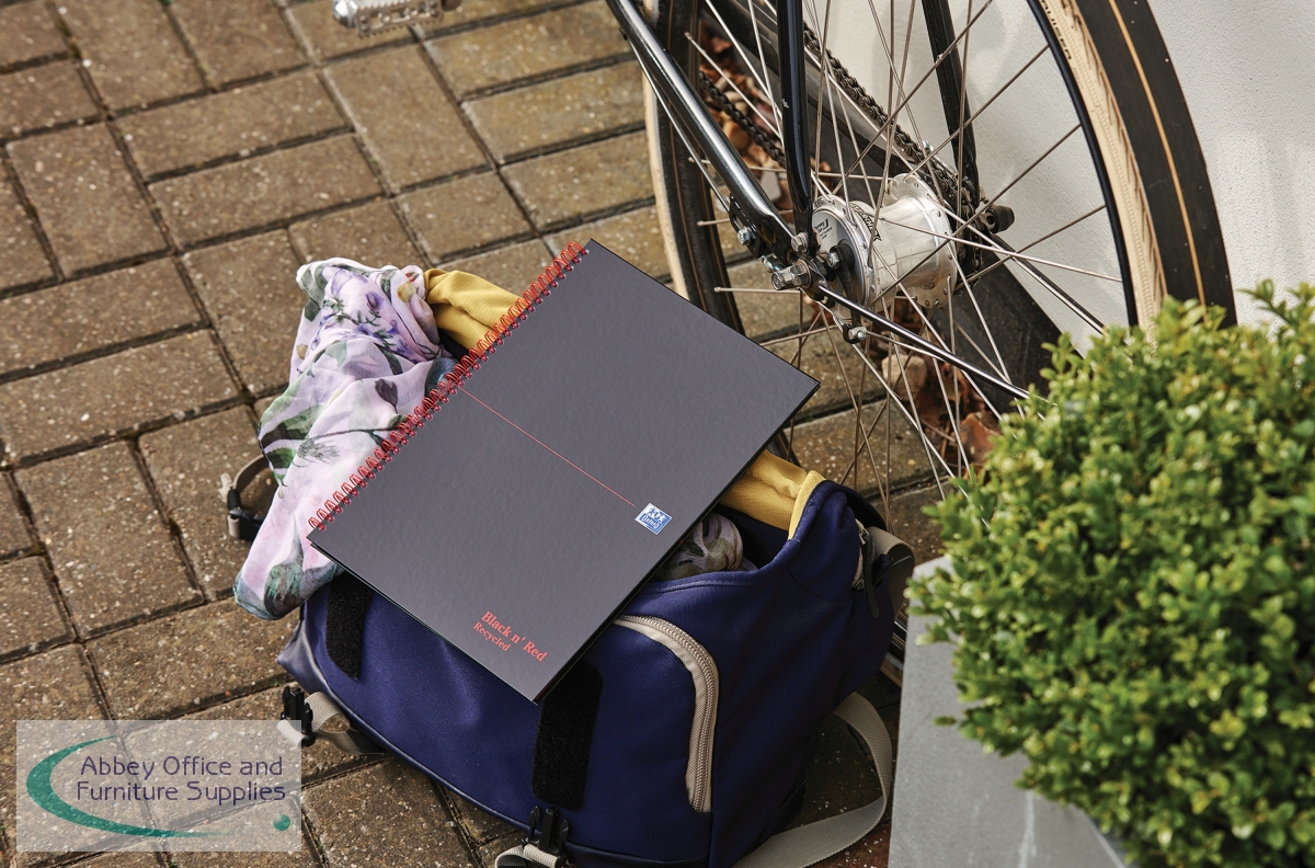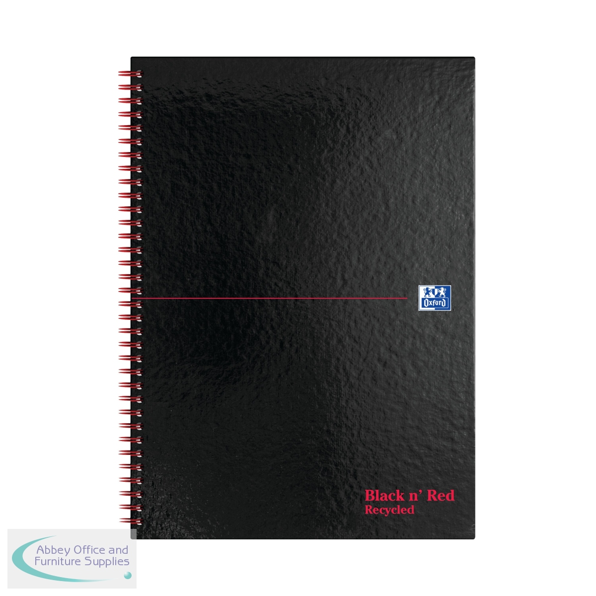 This stylish, professional Black n' Red notebook contains 140 pages of high quality, recycled 90gsm Optik paper, which is designed for minimum ink bleed through and is ruled for neat notes. The wirebound notebook features glossy hardback covers, which lie flat for easy note-taking. This pack contains 5 A4 notebooks.