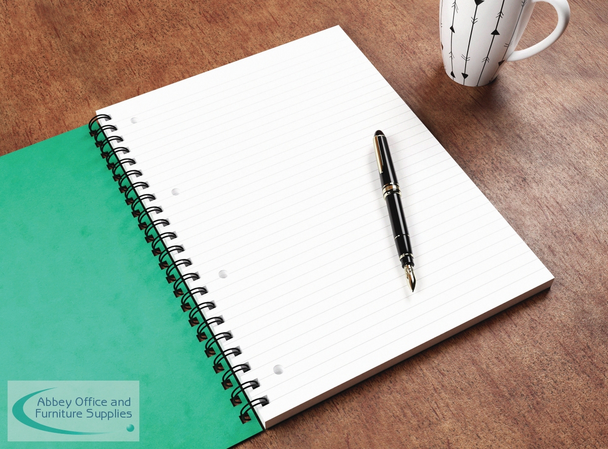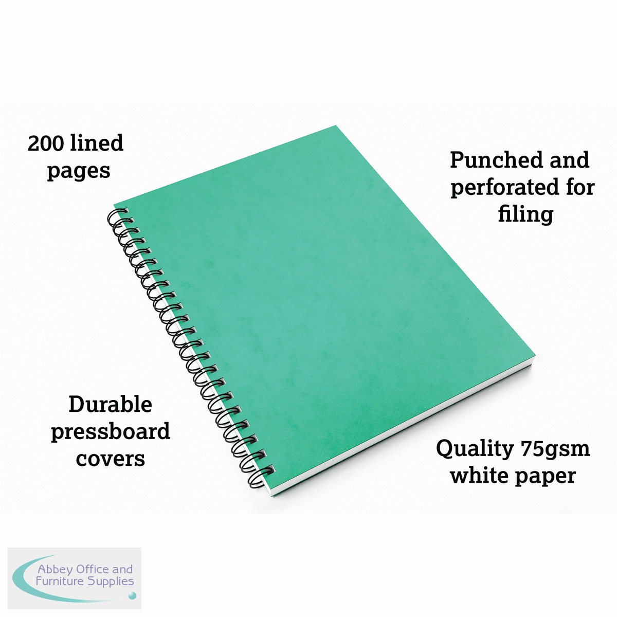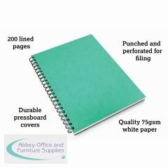 This Silvine notebook contains 200 pages of quality paper. The notebook is wirebound, allowing it to lie flat, with perforated pages for easy removal. The pages are feint ruled for neat note-taking and the notebook comes with stiff green and yellow pressboard covers. This pack contains 6 x A4 notebooks.
