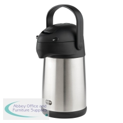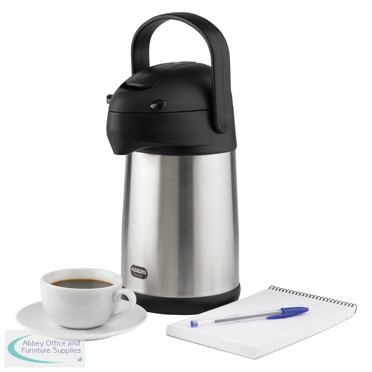 The Addis President Pump Vacuum Jug provides an easy and stylish way to dispense hot or cold drinks at a hospitality event. Simply press down on the plastic top to allow the contents to flow out through the easy-clean nozzle. With a double-walled vacuum construction, it keeps hot or cold beverages at a constant temperature for up to six hours. The strong stainless steel construction is virtually unbreakable. Plus, there's a plastic swing handle for easy carrying.