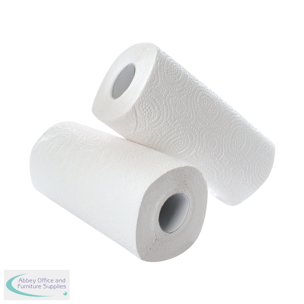 This kitchen roll features a highly absorbent texture, which effortlessly soaks up spilled water and other liquids, and can easily wipe away dirt and dust for sanitary surfaces. Each sheet is specially bonded to be extra thick and strong for reliable use. This bulk pack includes 12 packs of 2 white rolls, ideal for shared kitchens and stocking cleaning cupboards.