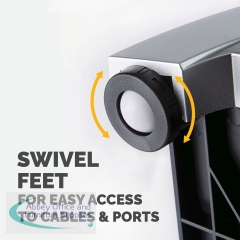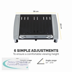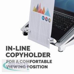 This Fellowes Office Suites Laptop Stand Plus is suitable for laptops up to 17 inches and features adjustable height settings from 114 - 190mm, and angle adjustments from 14 to 27.5 degrees for comfortable viewing. The Stand also features an integrated in-line copyholder, swivel feet for cable access and air vents to help avoid overheating. This black/silver laptop Stand has a maximum weight capacity of 5kg.