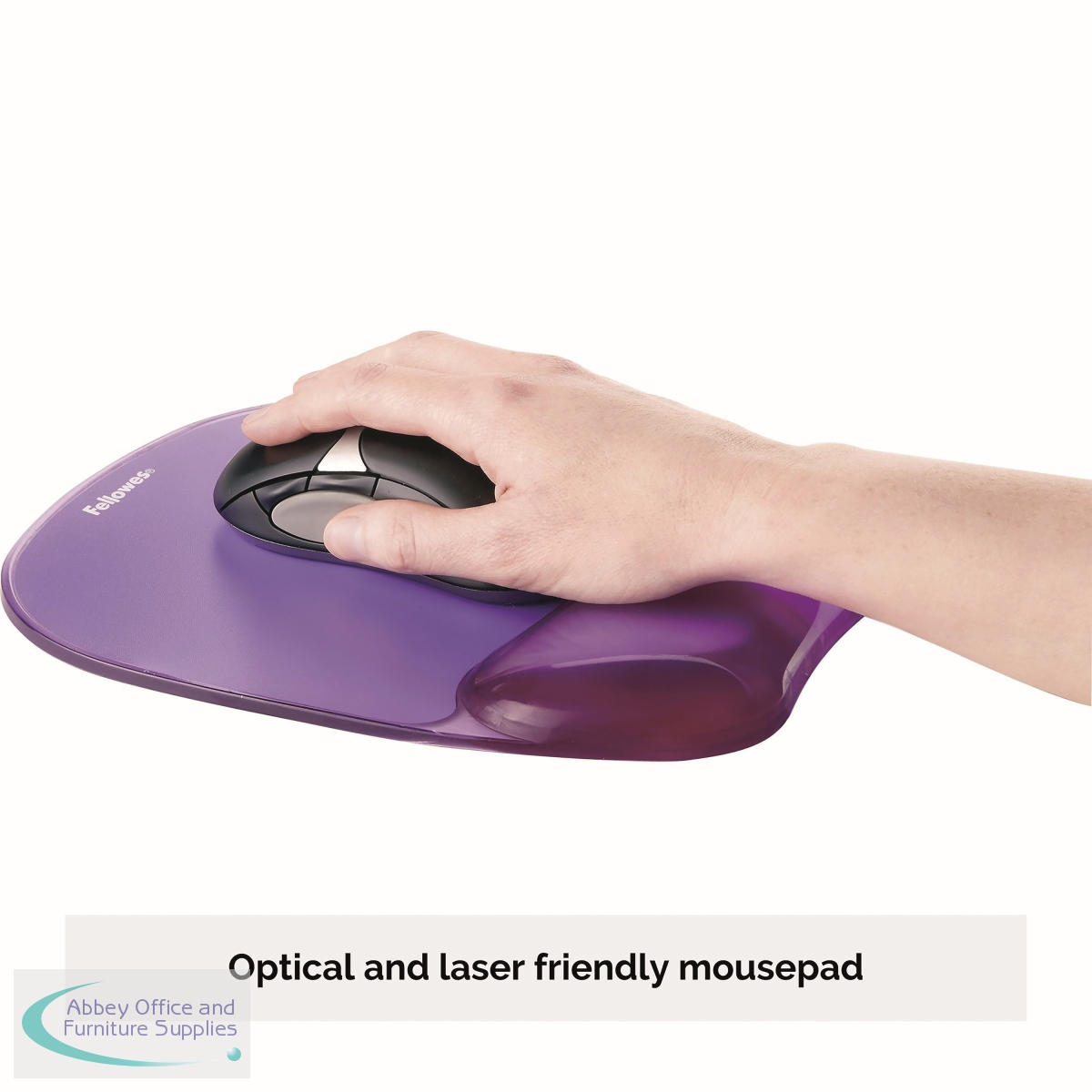 This Fellowes Crystals mouse pad features a soft gel padding with a stain resistant, wipe clean polyurethane cover. The ergonomic design supports the wrist, helping to alleviate pressure and provide comfort. The mouse pad also features a non-slip backing. This pack contains 1 mouse pad in purple.
