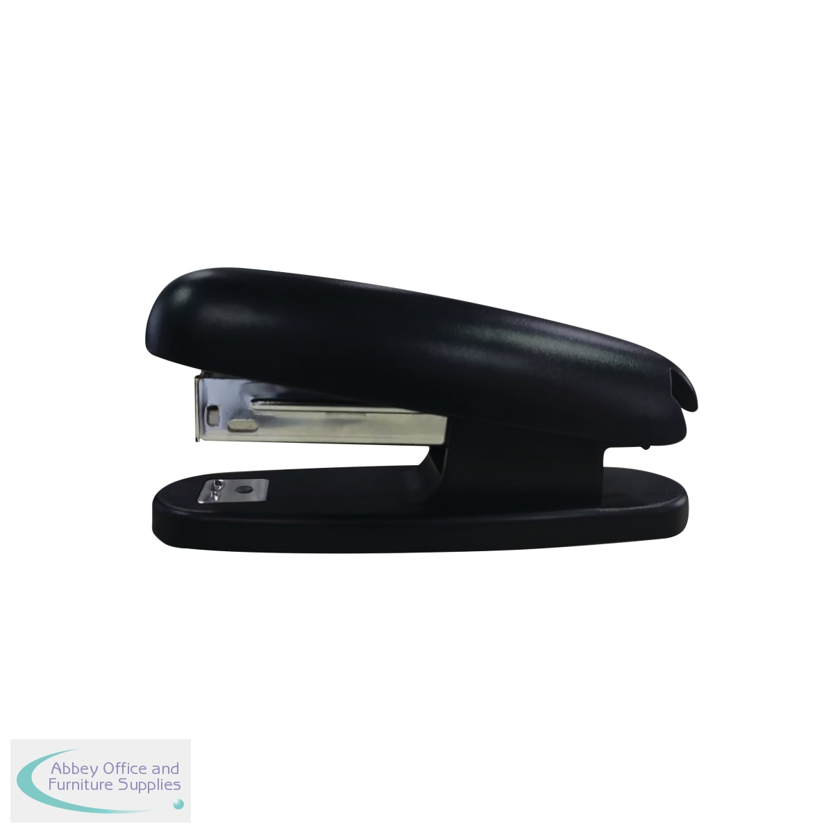 This economical half strip stapler features a metal chassis encased in a durable ABS plastic casing. The compact, lightweight design is ideal for everyday, desktop use. This pack contains 1 black stapler.
