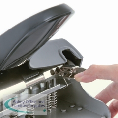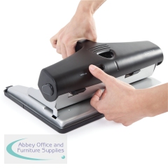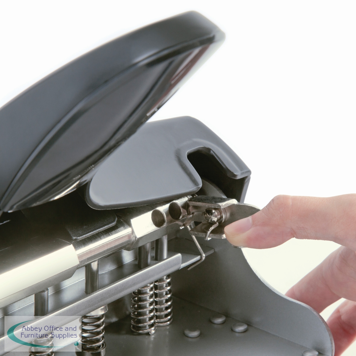This Rapesco Adjustable Heavy Duty Punch features a variety of settings for punching 2, 3 and 4 hole A4 and A3 paper, and 2 hole A5 paper. The double hardened stainless steel construction has a punching capacity of up to 32 sheets of 80gsm paper. The black punch also features an extended handle that locks down for storage and an easy to empty, flip open confetti tray.