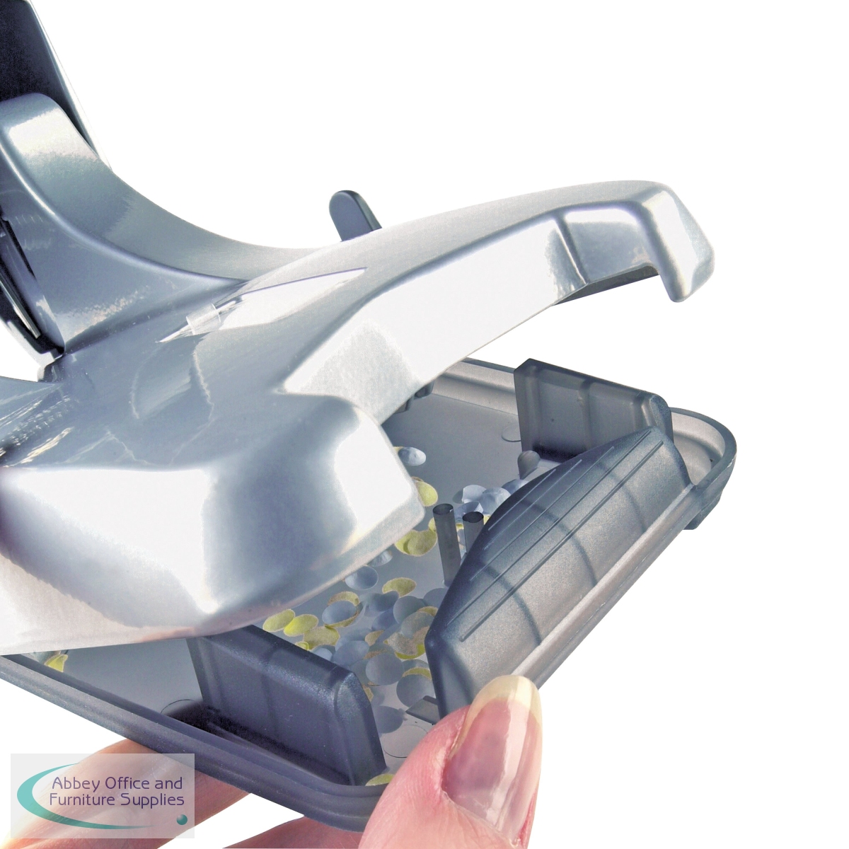 This heavy duty Rapesco Zero-65 hole punch features an extended, single piece handle for easily punching up to 65 sheets of 80gsm paper. The hole punch also features a personalisation window, adjustable paper guide, rubberised flip open confetti tray and a handle lock down switch for convenient storage. This pack contains 1 silver hole punch.