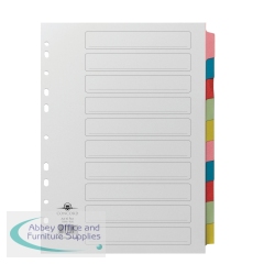 This Concord A4 10-part subject divider makes arranging and indexing your filing and presentations easier than ever. It comes with a pre-printed contents page that lets you add your own section titles and notes for even better organisation. These dividers are made of strong 160 micron board, making them the hard wearing and functional choice for students or businesses. Standard Euro punching fits almost any A5 ring binder or lever arch file.