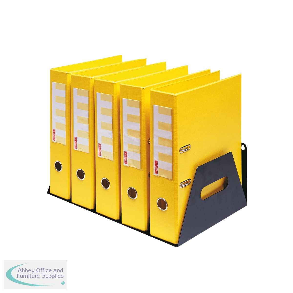 A smart and unobtrusive black metal filing rack that will organise up to five lever-arch files. Designed to either be attached to a wall or sit on a desktop, the rack presents an ideal way to keep those odd folders looking neat and professional. With non-slip rubber feet to avoid marks and scuffs, you can rest assured your desktop will remain in top condition. Small and sturdy, this is the perfect solution for your personal filing needs.