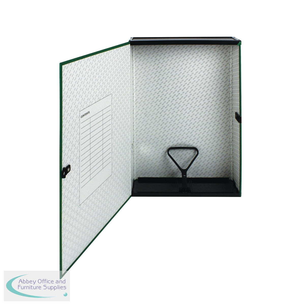 Suitable for long term storage of both A4 and foolscap documents, this Q-Connect coloured box file features an internal spring clip to keep contents secure and a strong lid clip for protection. The box file also has a finger ring for easy retrieval from a shelf, 75mm filing capacity and spine label for quick identification. Ideal for colour coordinated filing, this pack contains 5 green box files.
