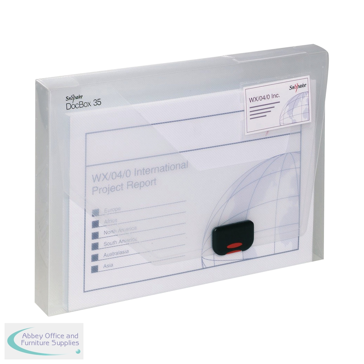 Strong and stylish, this Snopake DocBox is made from heavy gauge polypropylene that is welded for extra strength. A cutaway front provides easy access, with a push-lock clasp to keep contents secure. Suitable for A4 filing, the box also features a business card holder. This pack contains one clear A4 DocBox with a 35mm capacity.