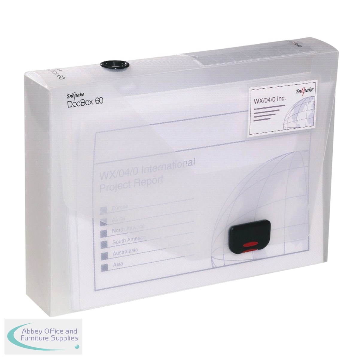 Strong and stylish, this Snopake DocBox is made from heavy gauge polypropylene that is welded for extra strength. A cutaway front provides easy access, with a push-lock clasp to keep contents secure. Suitable for A4 filing, the box features 2 index windows, one of which can be used as a business card holder. This pack contains one Clear A4 DocBox with a 60mm capacity.