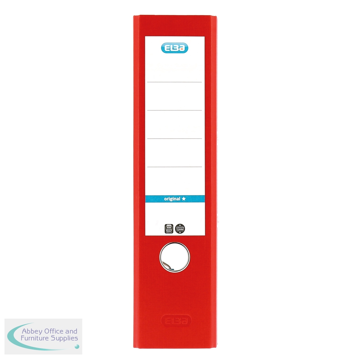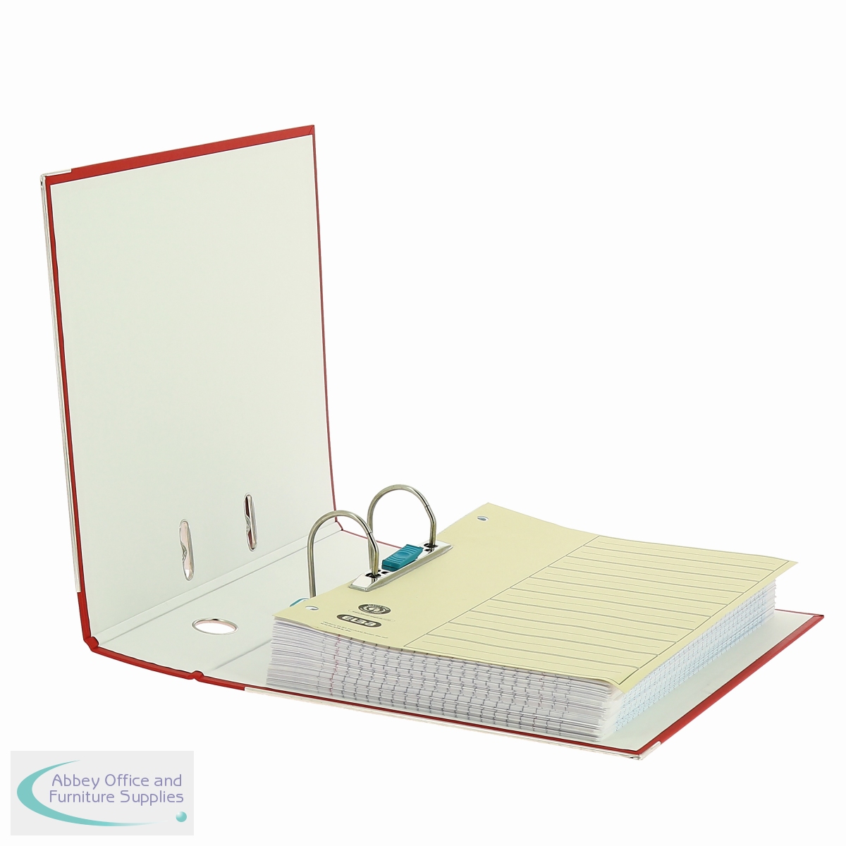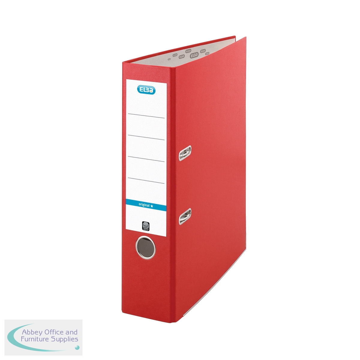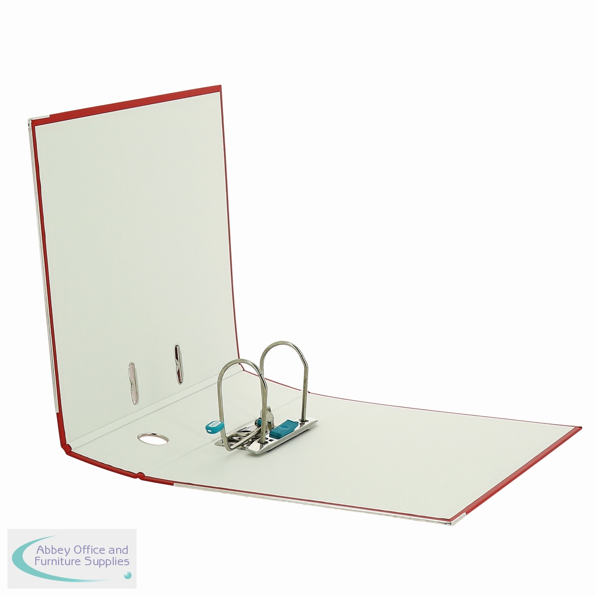 This Elba file features a standard lever arch mechanism with a 70mm capacity for filing A4 documents. Made from strong board, the file features a metal reinforced edge and metal thumb hole for easy retrieval from a shelf. This product is made from 76% recycled materials. This pack contains 10 red lever arch files, ideal for colour coordinated filing.