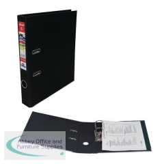 This Esselte lever arch file features a 50mm spine, which can hold up to 350 sheets of 80gsm A4 paper. The file also features durable polypropylene covers, a metal thumb hole for easy retrieval from a shelf and metal edges for long lasting use. This pack contains 10 black lever arch files.