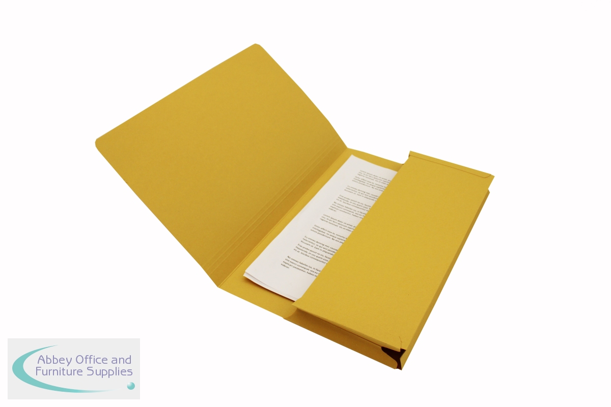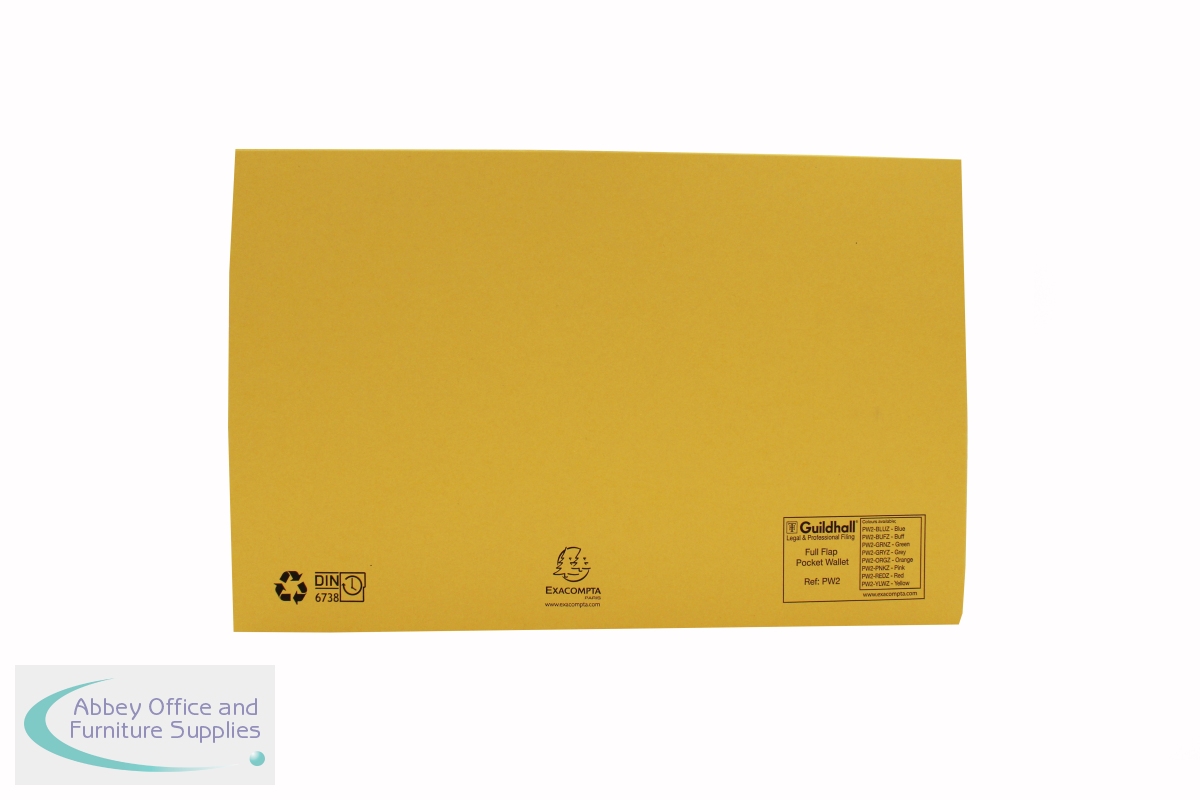 This Exacompta Guildhall pocket wallet is made from premium quality 315gsm manilla and features a full flap for additional security of contents. The wallet has a 35mm gusset and can hold up to 350 sheets of A4 or foolscap paper. This pack contains 50 yellow wallets, ideal for colour coordinated filing.