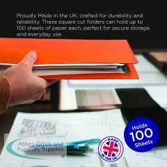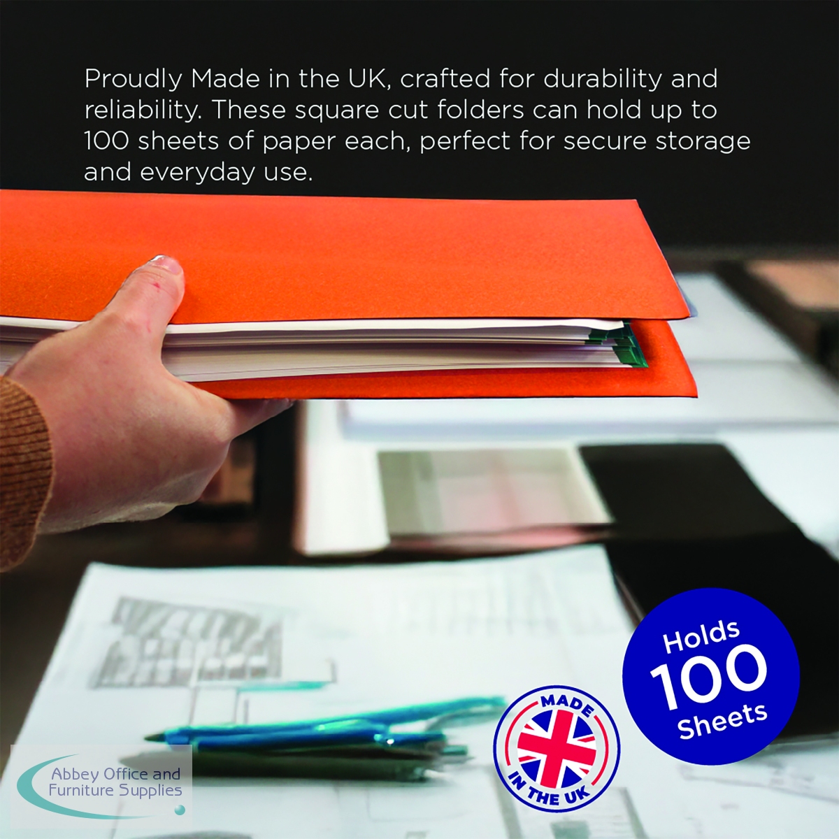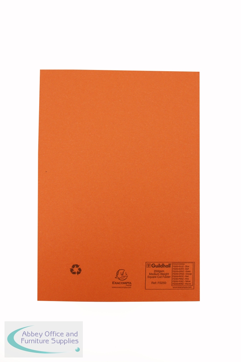 These environmentally friendly Guildhall square cut folders are made from 100% recycled, mediumweight 250gsm manilla. Suitable for filing both A4 and foolscap documents, each folder can hold up to 100 sheets of 80gsm paper. This pack contains 100 orange folders.