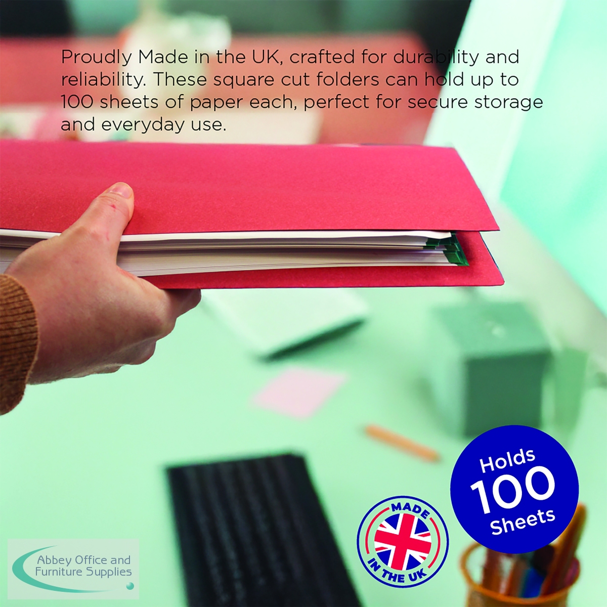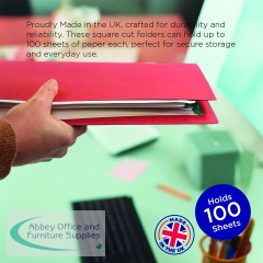 These environmentally friendly Guildhall square cut folders are made from 100% recycled, mediumweight 250gsm manilla. Suitable for filing both A4 and foolscap documents, each folder can hold up to 100 sheets of 80gsm paper. This pack contains 100 red folders.