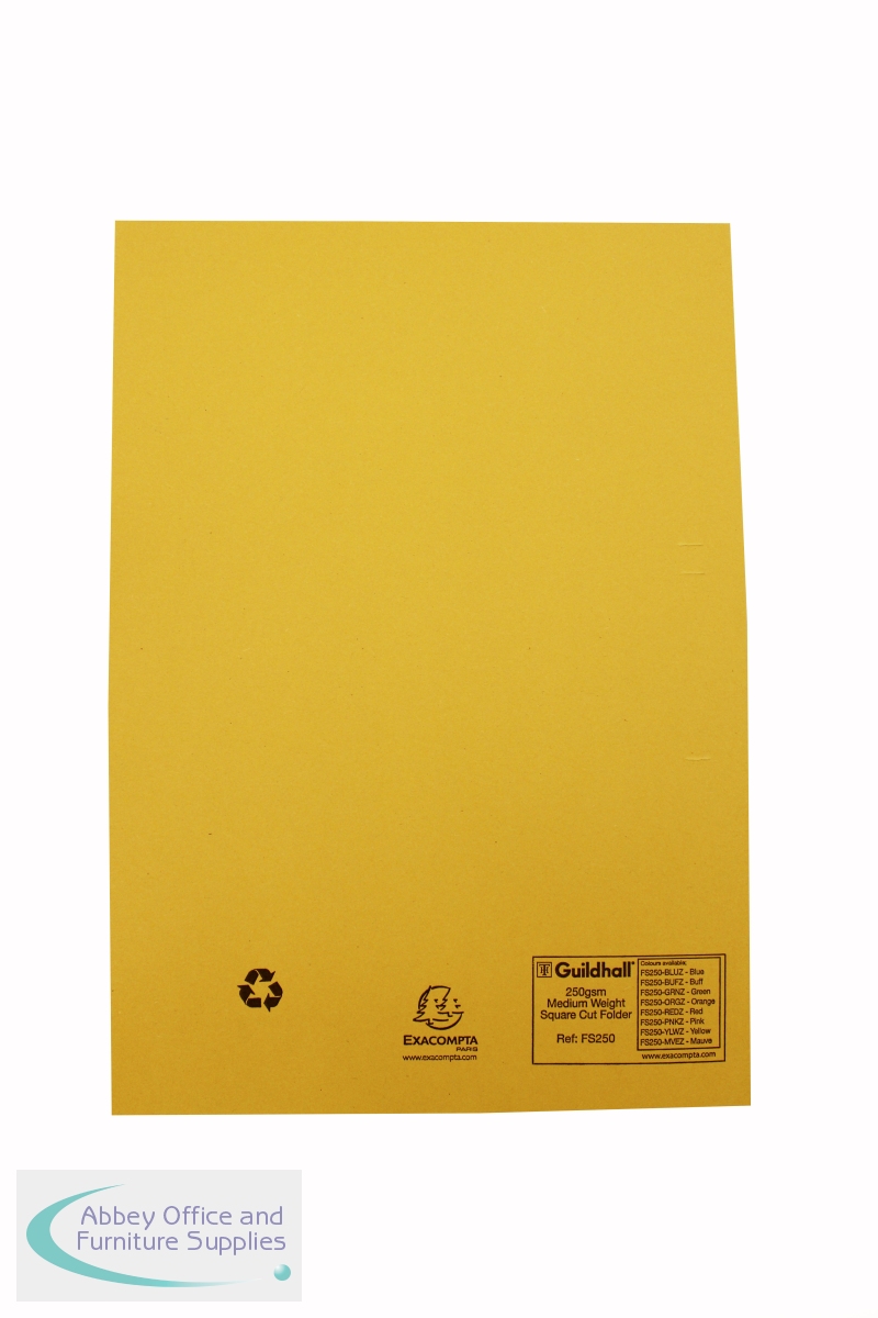 These environmentally friendly Guildhall square cut folders are made from 100% recycled, mediumweight 250gsm manilla. Suitable for filing both A4 and foolscap documents, each folder can hold up to 100 sheets of 80gsm paper. This pack contains 100 yellow folders.