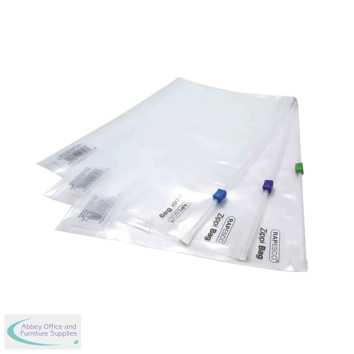 These lightweight, flexible Rapesco Zippi A4+ bags are ideal for filing and storage of A4 documents, stationery, small accessories and more. The bags are clear for easily viewing contents, with assorted coloured plastic zips to help keep contents secure. This pack contains 25 bags.