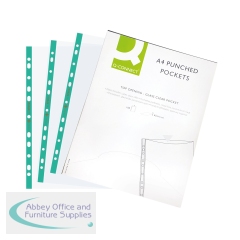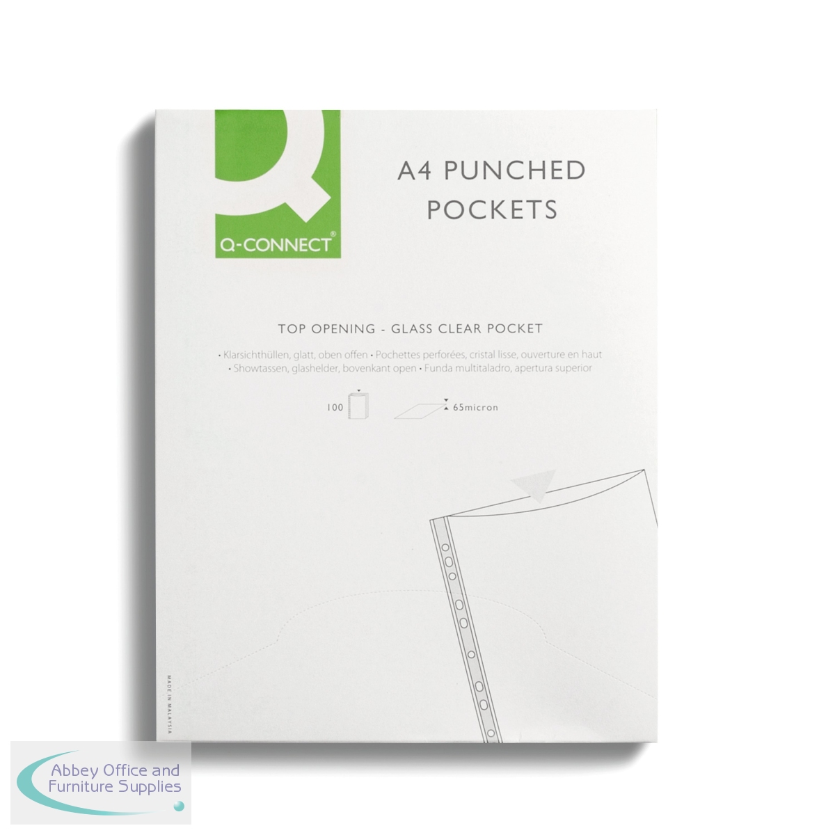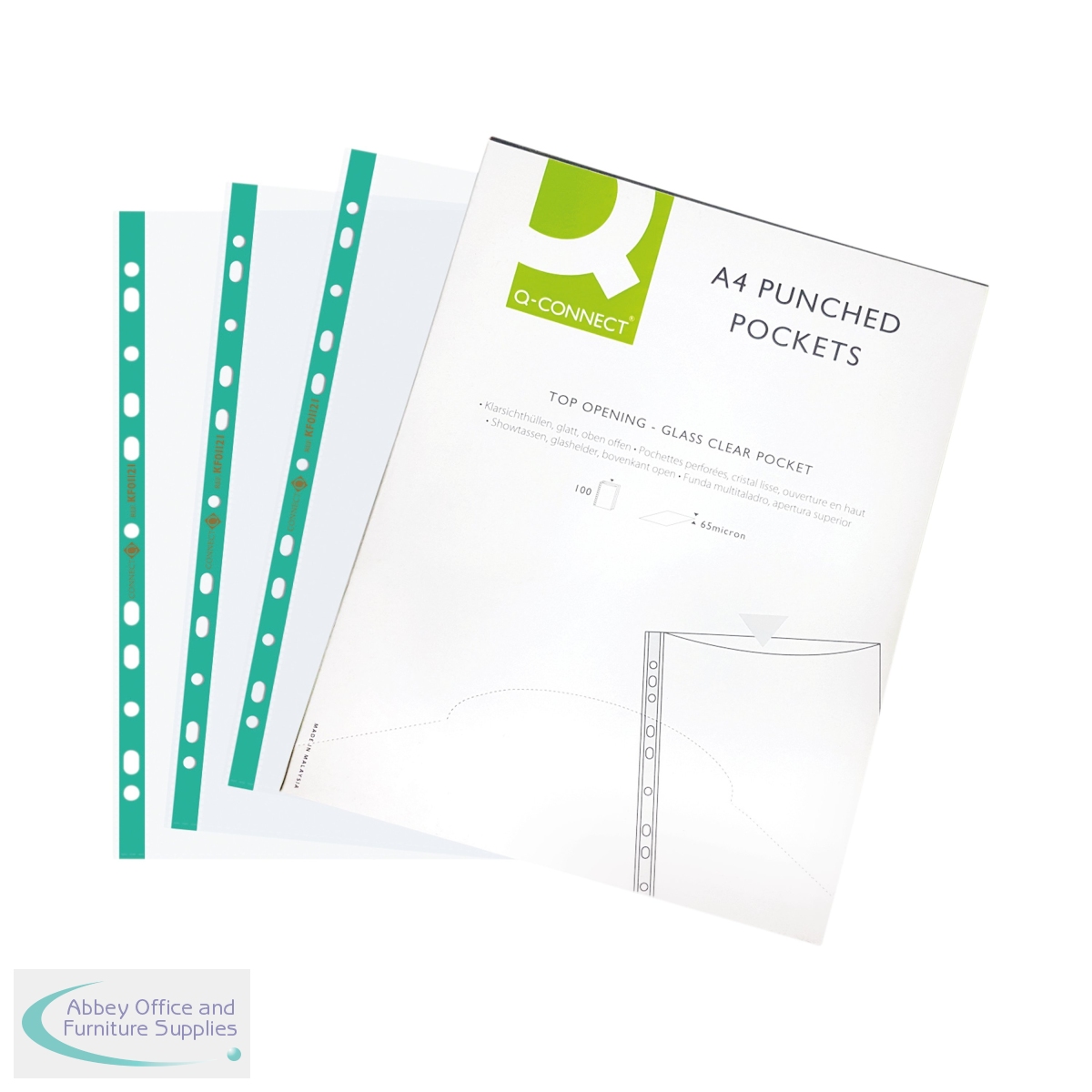 Great for presentations, displays and general filing, these durable and versatile Q-Connect punched pockets are A4 size and multi-punched for use in standard ring binders or lever arch files. The glass clear 65 micron pockets are also top opening for quick and easy access to documents. This pack contains 100 punched pockets.