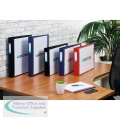 This stylish professional Elba Vision A3 oblong ring binder features a clear front pocket for personalisation, ideal for presentations, projects and more. The portrait binder has a 4 D-ring mechanism with a 30mm (300 sheet) capacity for filing A3 documents. Made from durable polypropylene covered board with a 40mm spine width, this pack contains a single blue ring binder.