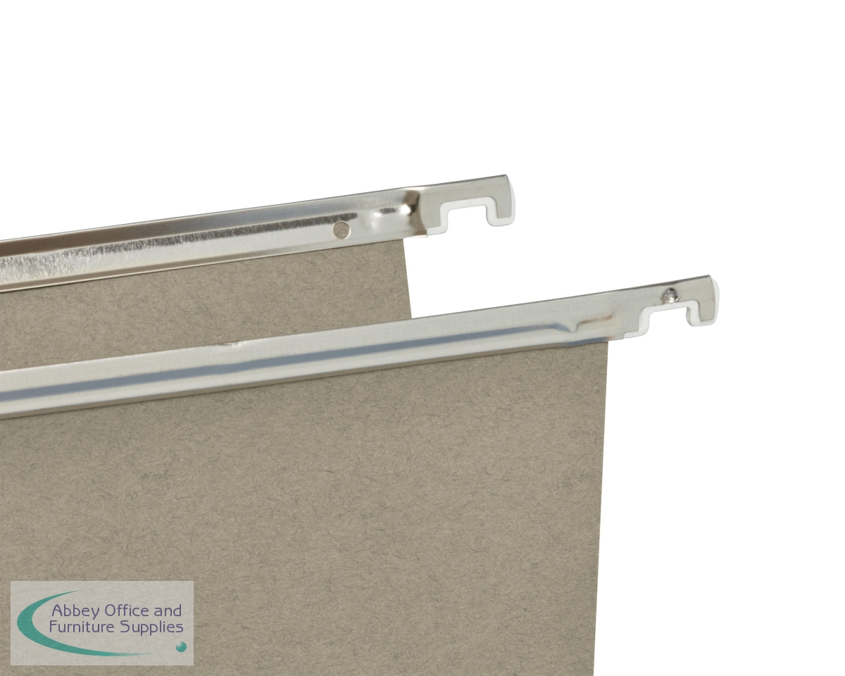 This environmentally friendly Rexel Multifile foolscap suspension file with standard V shaped base is made from 100% recycled manilla and can hold up to 150 sheets of A4 or foolscap paper. The file measures 387mm across the bar and is supplied complete with tabs and inserts for easy labelling. This pack contains 50 green suspension files.