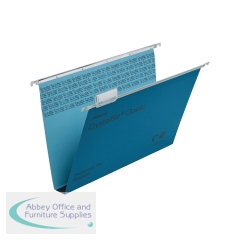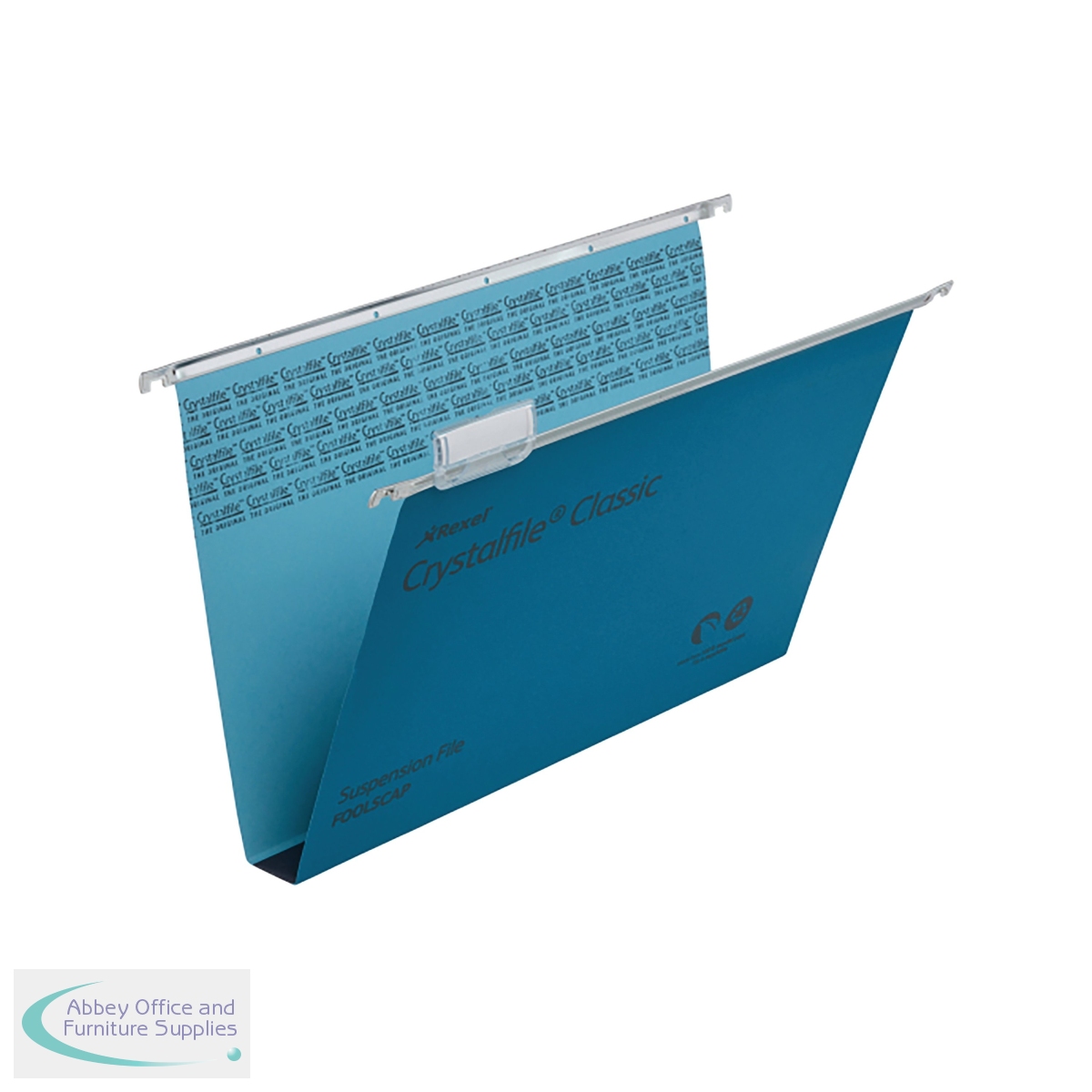 The Rexel Crystalfile Classic suspension file is made from premium quality manilla for long lasting use. Ideal for loose document storage, its pre-printed labelling area ensures easy referencing whenever you need to search back through your documents. Able to accommodate up to 300 sheets of 80gsm paper, it includes multi-positionable plastic tabs and printable card inserts. These suspension files can be used for filing cabinets, desk drawer chassis and desk top organisers. This pack contains 50 blue foolscap files.