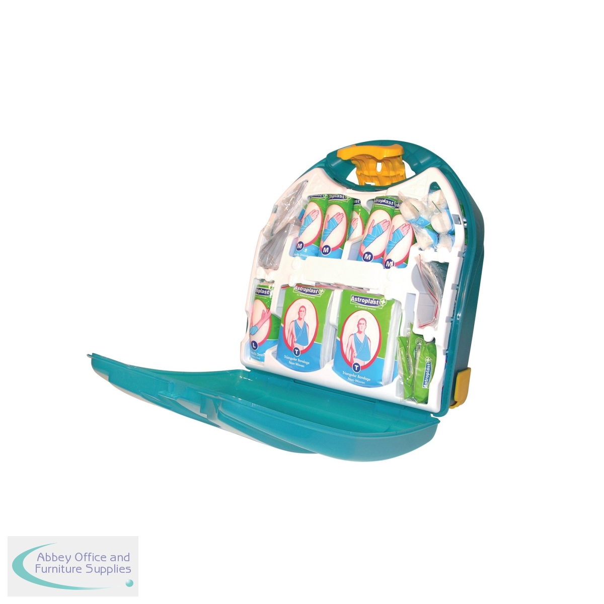 This convenient, all in one first aid kit provides everything you need in the event of a minor scrape or accident. Suitable for use by up to 20 people, it includes a guidance leaflet, plasters, eye pads, bandages, safety pins, dressings, gloves and wipes to cover any eventuality. The kit comes in a convenient and hardwearing plastic case that has and easy to use carry handle and is also wall mountable so it's always close at hand.
