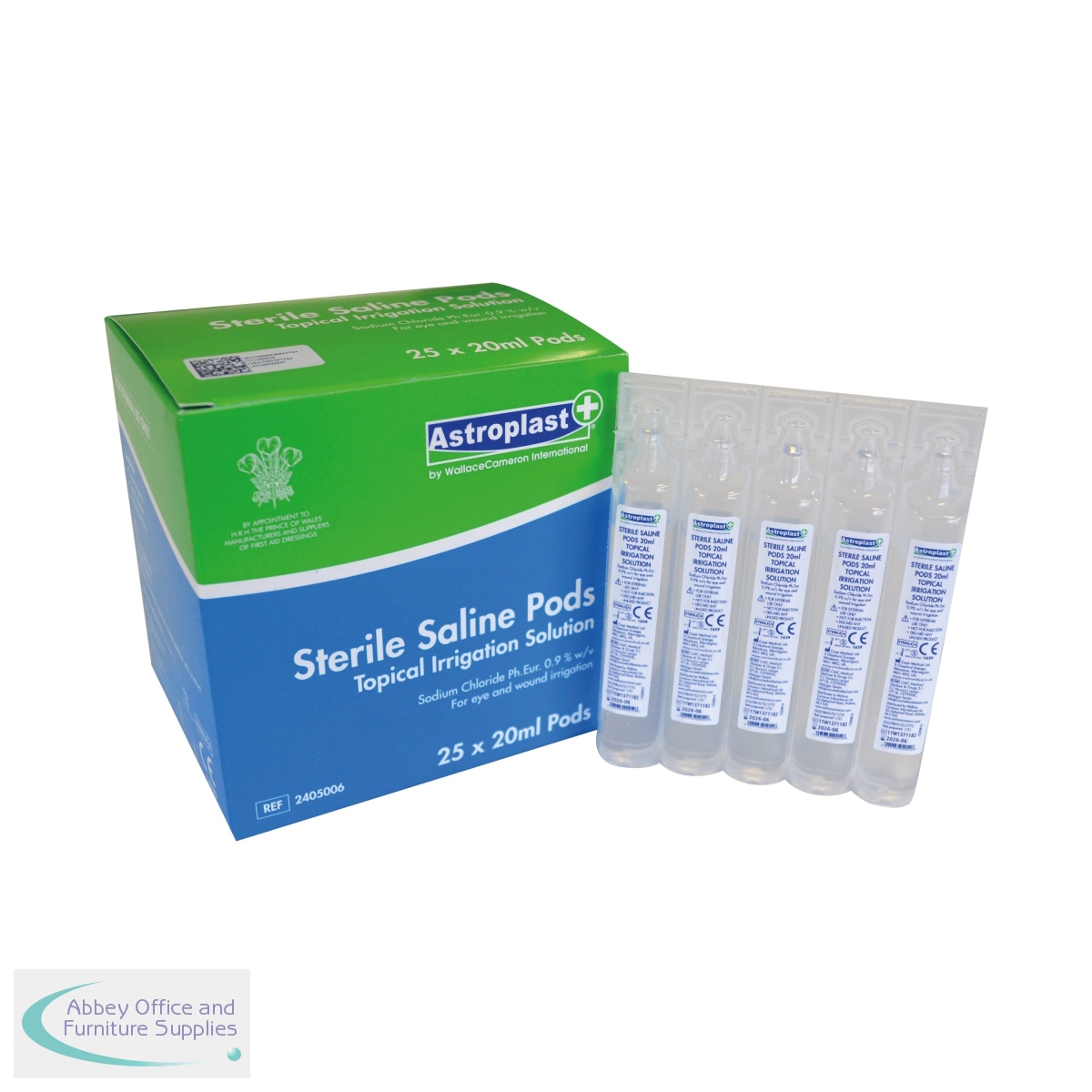 This pack of twenty five saline eye pods from Wallace Cameron are handy and convenient to have in the event of an eye related accident or injury. The pods provide saline solution to irrigate the eye, cleaning the eyeball and ensuring no further damage or infection occurs. Each 20ml of solution comes in a plastic pod which is designed for convenient storage and easy access in the event of an emergency.