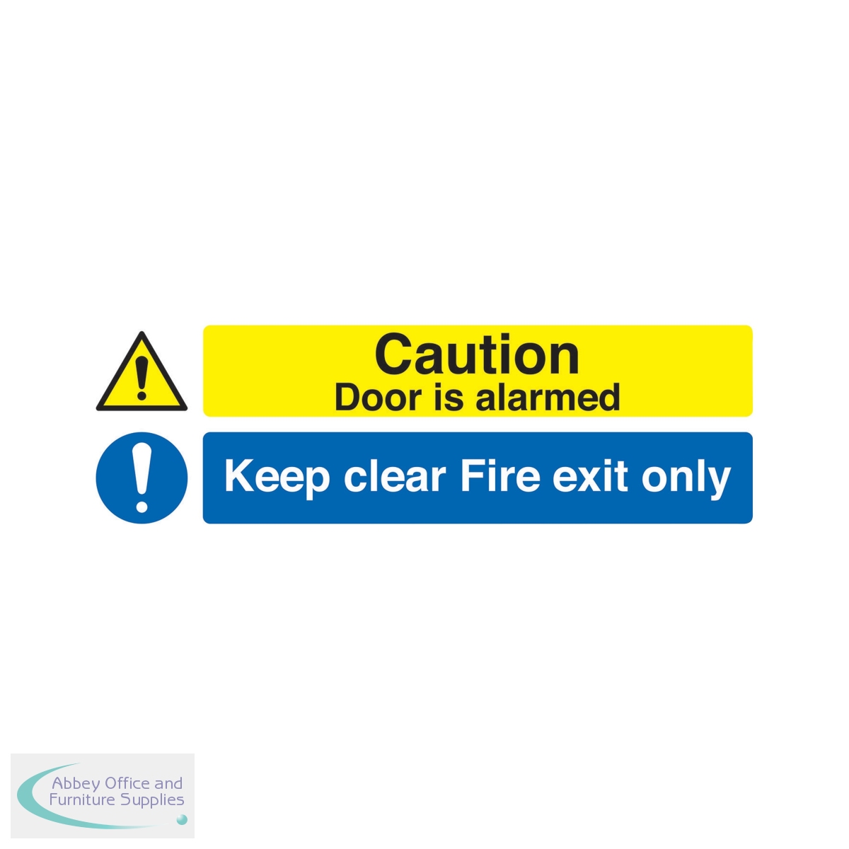 This sign both warns of a door that is alarmed and informs employees, visitors and customers of a fire exit that needs to be kept clear. This 150x450mm sign has a self-adhesive backing, allowing easy positioning on walls and doors, without the need for tools. The universal symbols are instantly recognisable for clear instruction to all site users.