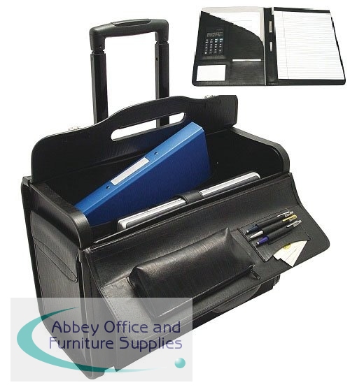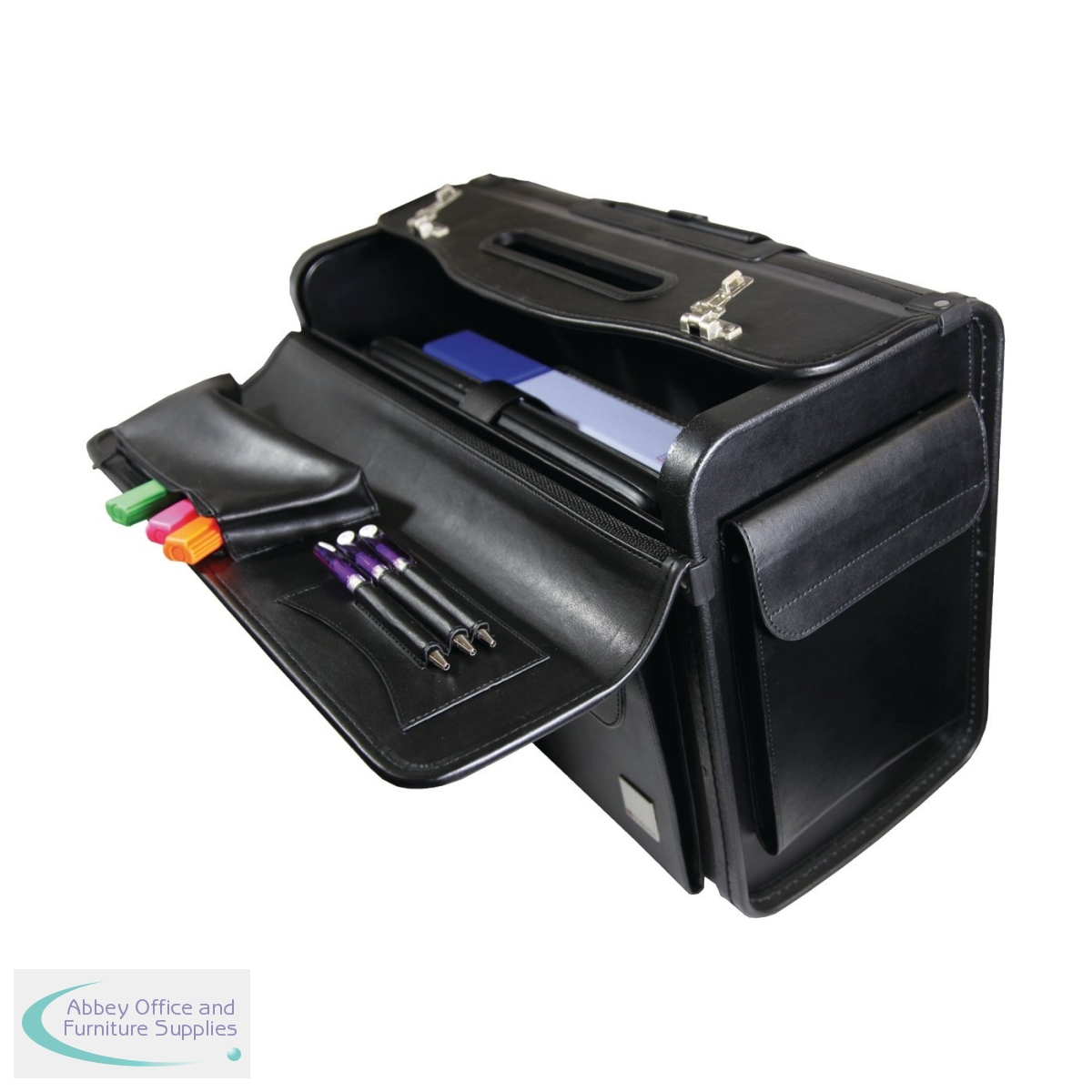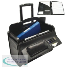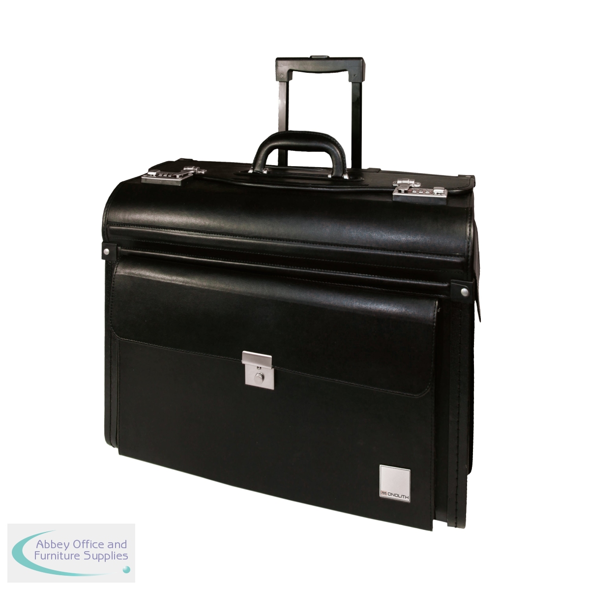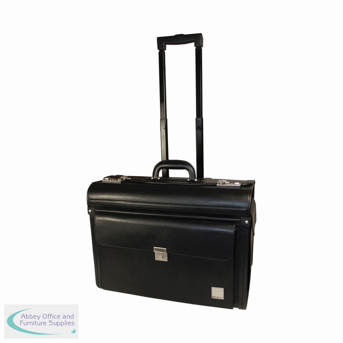 This stylish leather look Monolith pilot case features a telescopic handle and durable in-line skate wheels for easy portability. The large central compartment features a padded section for laptops up to 15.6 inches. The case also features lockable side pockets with nickel locks and a lid organiser. This black case measures W480 x D240 x H370mm.