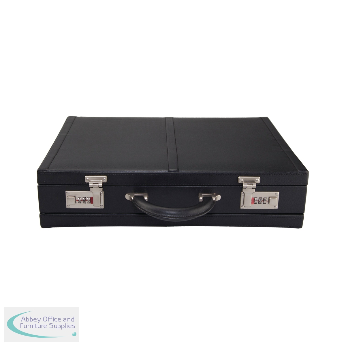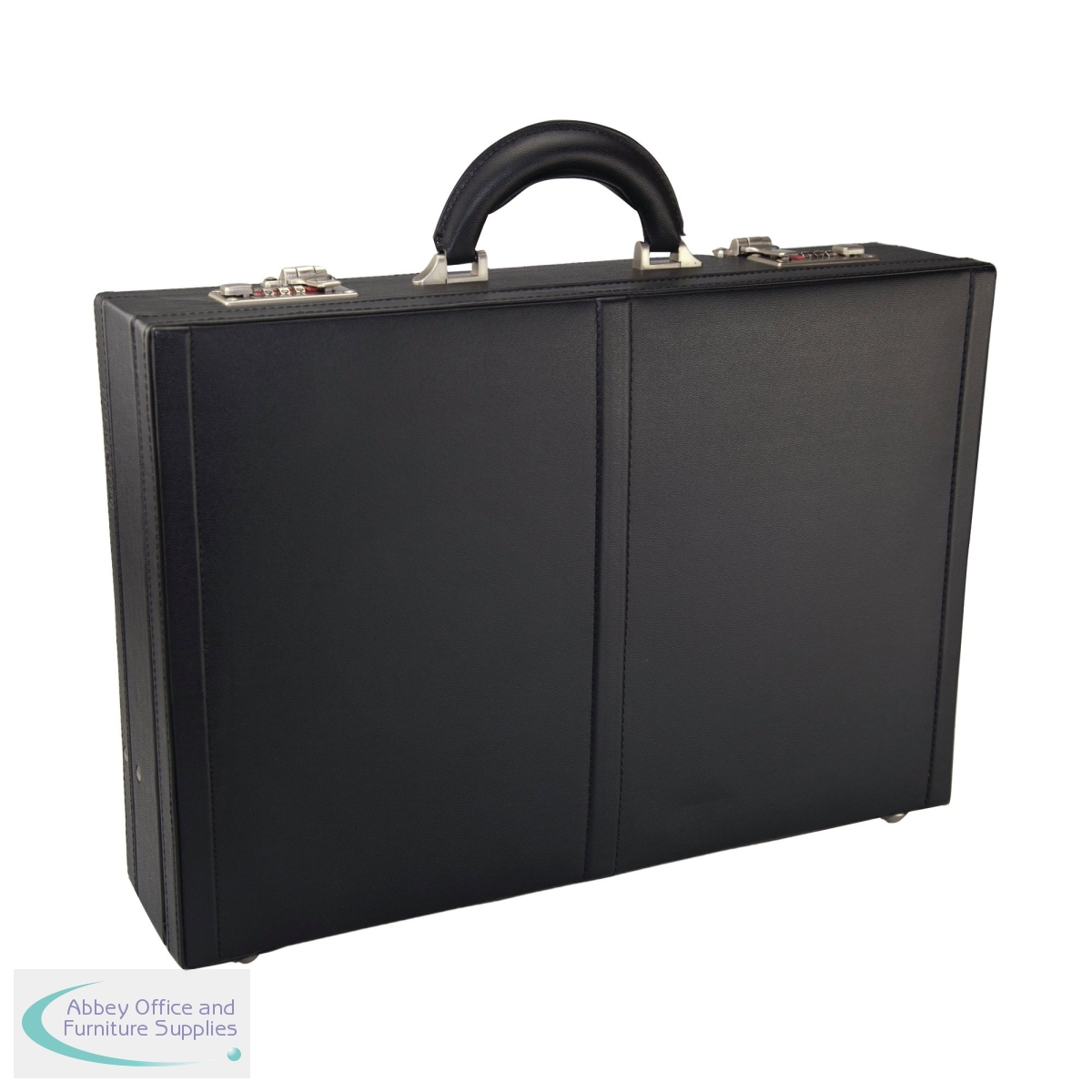 This Monolith leather look expanding attache case features a full organiser section in the lid with a dedicated tablet pocket. The case also features a soft flock lining with a business card pocket, pen holders and a mobile phone pocket. This black case features metal combination locks and fittings, and measures W440 x D100 x H310mm.
