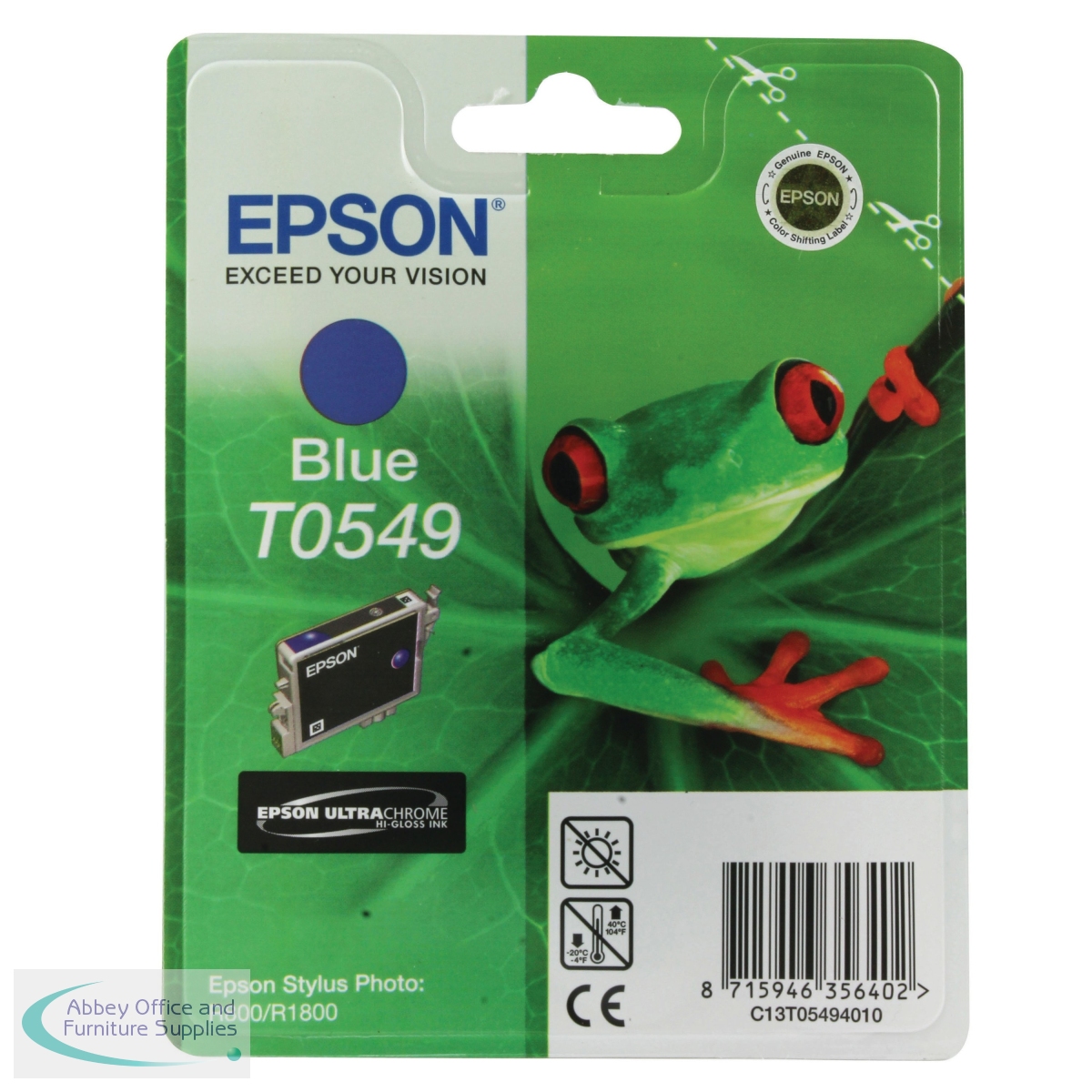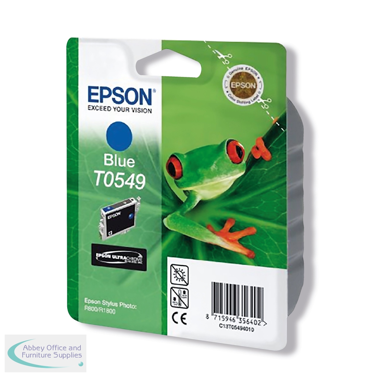 This Epson T0549 Blue Inkjet Cartridge is for use in Epson Stylus Photo R800 and R1800 printers. Each cartridge contains 13ml of ink with an approximate print yield of up to 400 pages. This pack contains 1 blue inkjet cartridge.