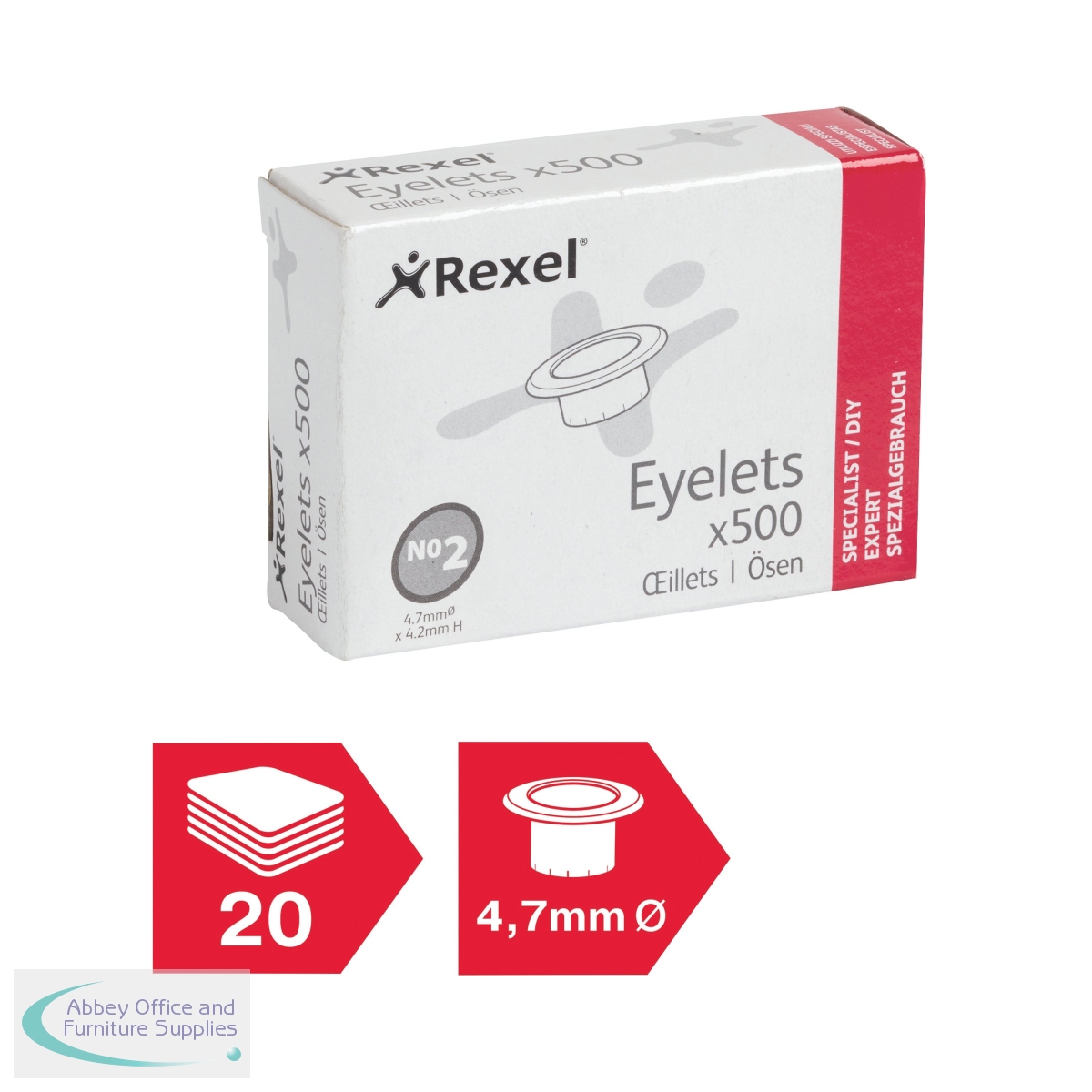 For use with the Rexel Eyeletter and Punch (VL20049), these copper plated brass eyelets have a 4.7mm diameter and are 4.2mm long for use with documents with up to 20 sheets of 80gsm paper. This pack contains 500 eyelets.