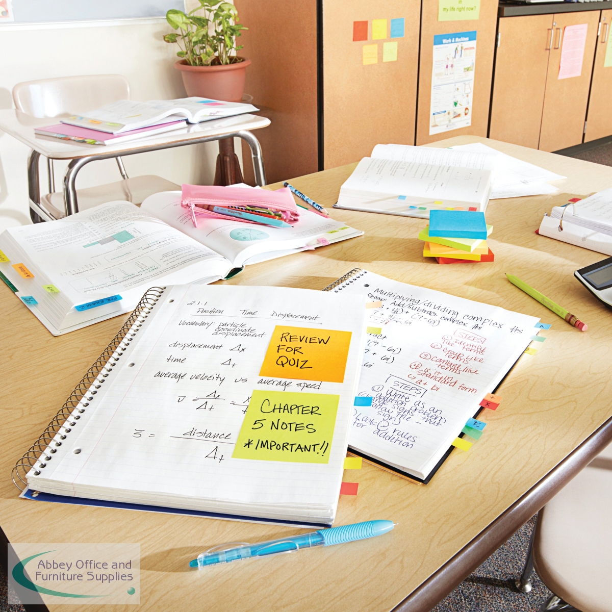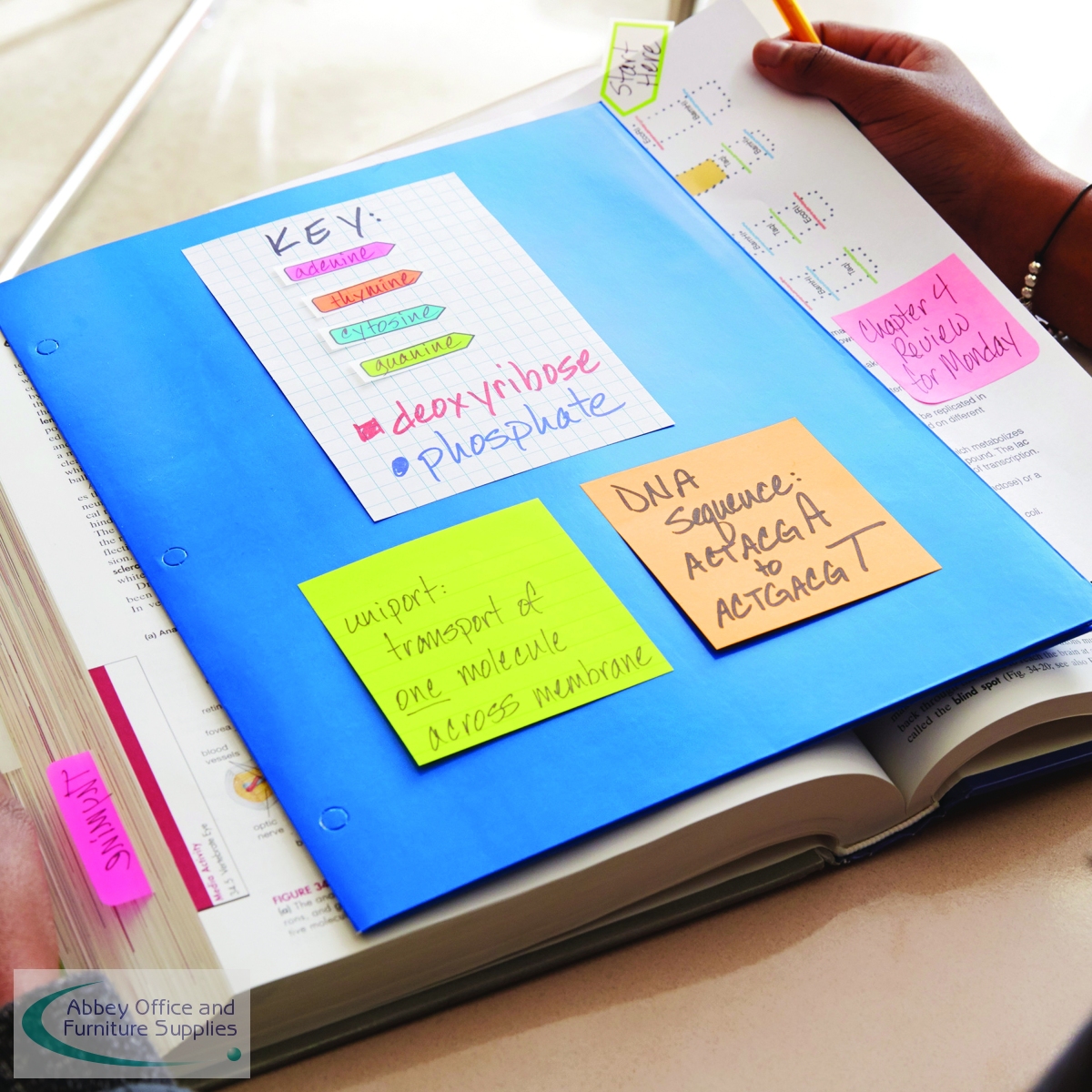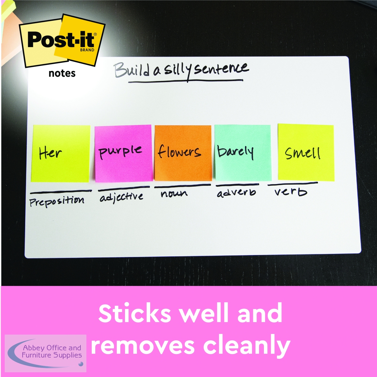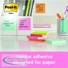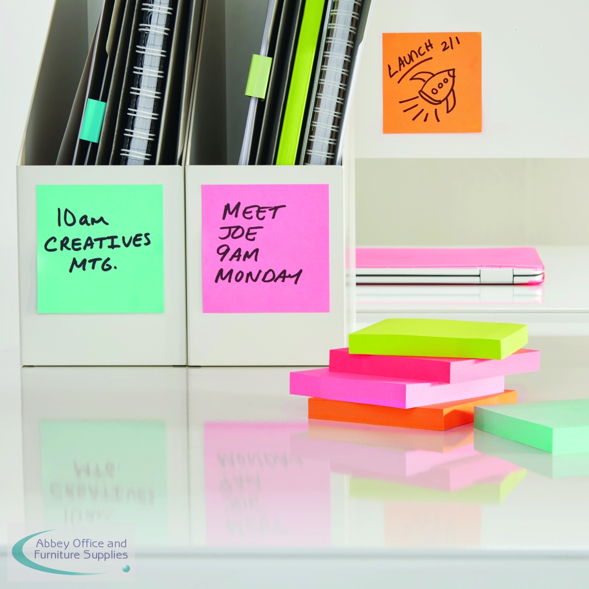 Ideal for desktop use, these repositionable Post-it Notes feature a strong adhesive that will adhere to most surfaces and remove cleanly, which is perfect for making notes or leaving messages and reminders. Each pad contains 100 sheets and measures 76 x 127mm. This pack contains 6 pads in assorted Energy colours: neon yellow, ultra blue, neon orange, fuchsia and neon green.