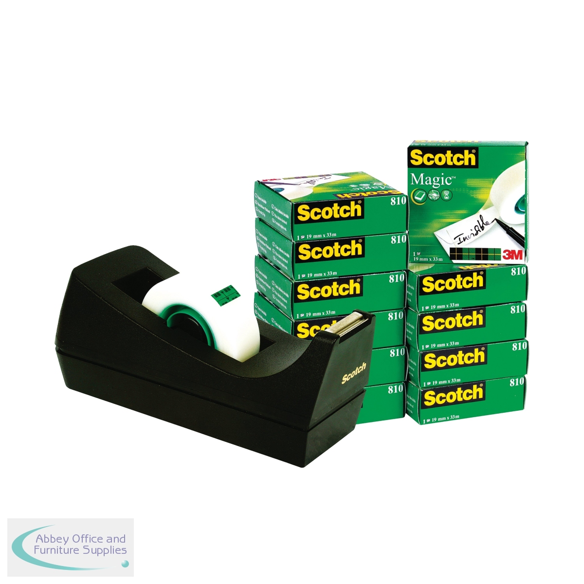 Scotch Magic Tape is a long lasting, solvent free tape that is designed not to yellow or dry out with age. Virtually invisible when applied, the tape is great for repairs to torn paper, or wrapping packages attractively. The matte surface can also be written on, which is ideal for adding labels or notices to parcels. This pack contains twelve 19mm x 33m rolls with a free black tape dispenser.