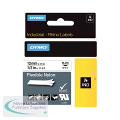 Supplied on a 3.5 metre roll, this 12mm, flexible nylon tape from Dymo is ideal for a range of industrial environments For use with the Rhino industrial label printers, this label tape can bend to fit curved surfaces and has an extra-strong adhesive which withstands the rigours of industrial use. Suitable for use as warning labels and personalisation of electrical or facility equipment; or as part of a colour coding system.