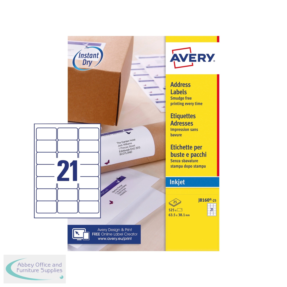 AV10615 - Avery Inkjet Address Labels QuickDRY 63.5x38.1mm 21 Per Sheet White (Pack of 525) J8160-25