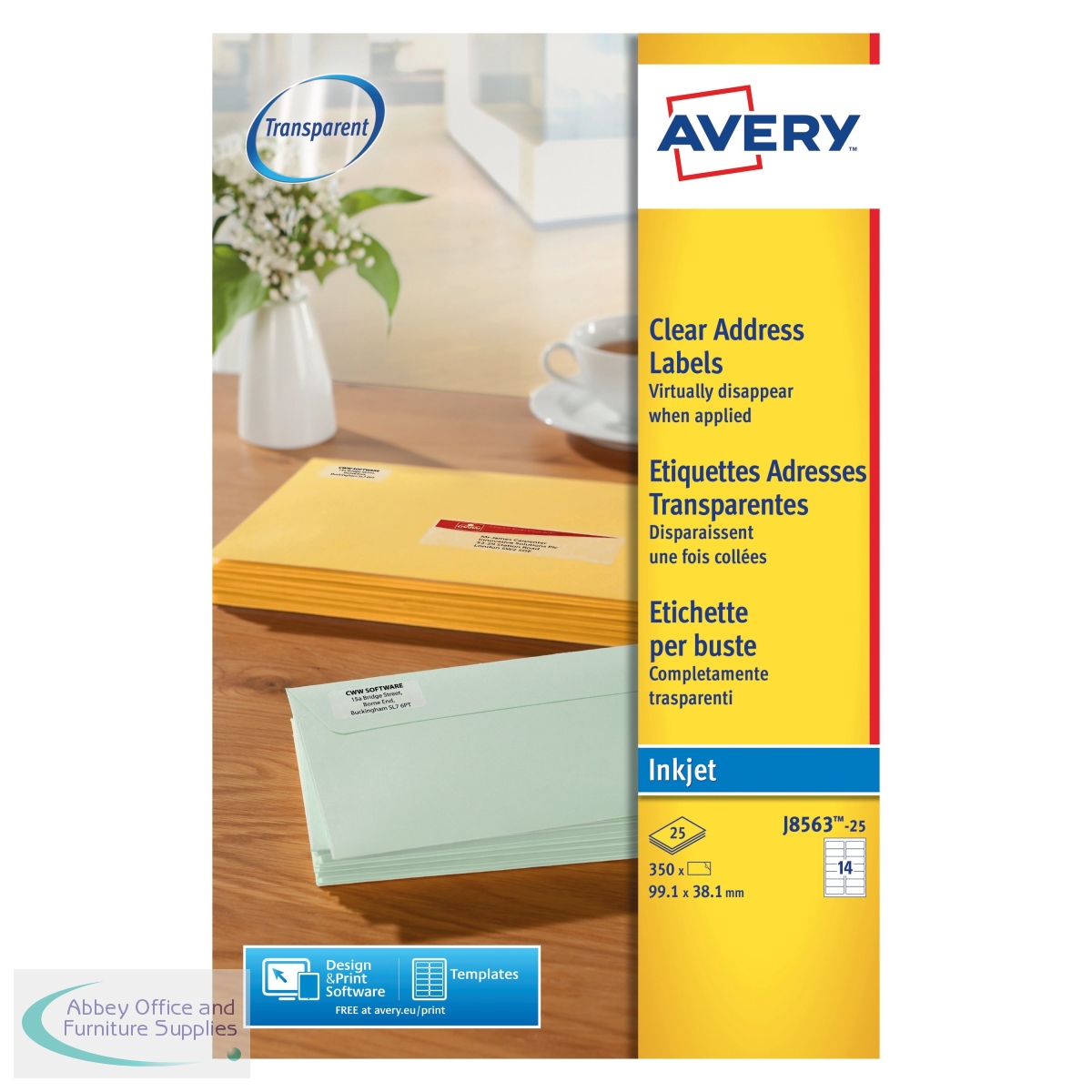 Avery Clear Inkjet Labels, for use on white or light colours, give the impression that the packaging has been typed on directly, making it neater and more professional looking. With QuickPeel, the labels are simple to use, streamlining posting and ensuring you get through a large workload with ease. These labels are designed to be used in inkjet printers and are compatible with templates from popular software such as Microsoft Word. This pack contains 25 sheets each with 14 labels (350 labels in total).