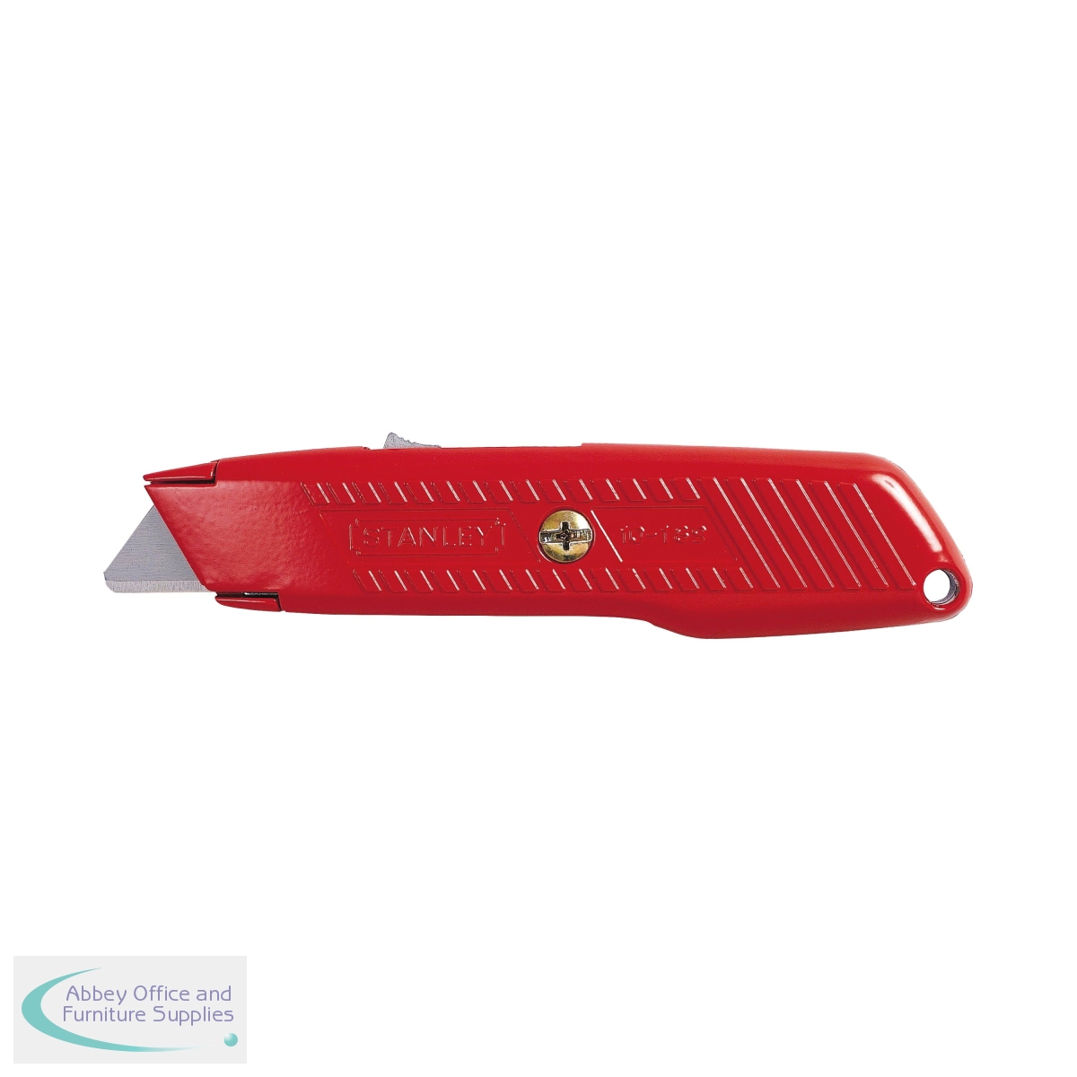 The Stanley Safety Spring Back Knife has a red high visibility body, which is ribbed to provide a firm grip. The blade automatically springs back inside the knife body as soon as pressure on the shifter button is released for safety in use.